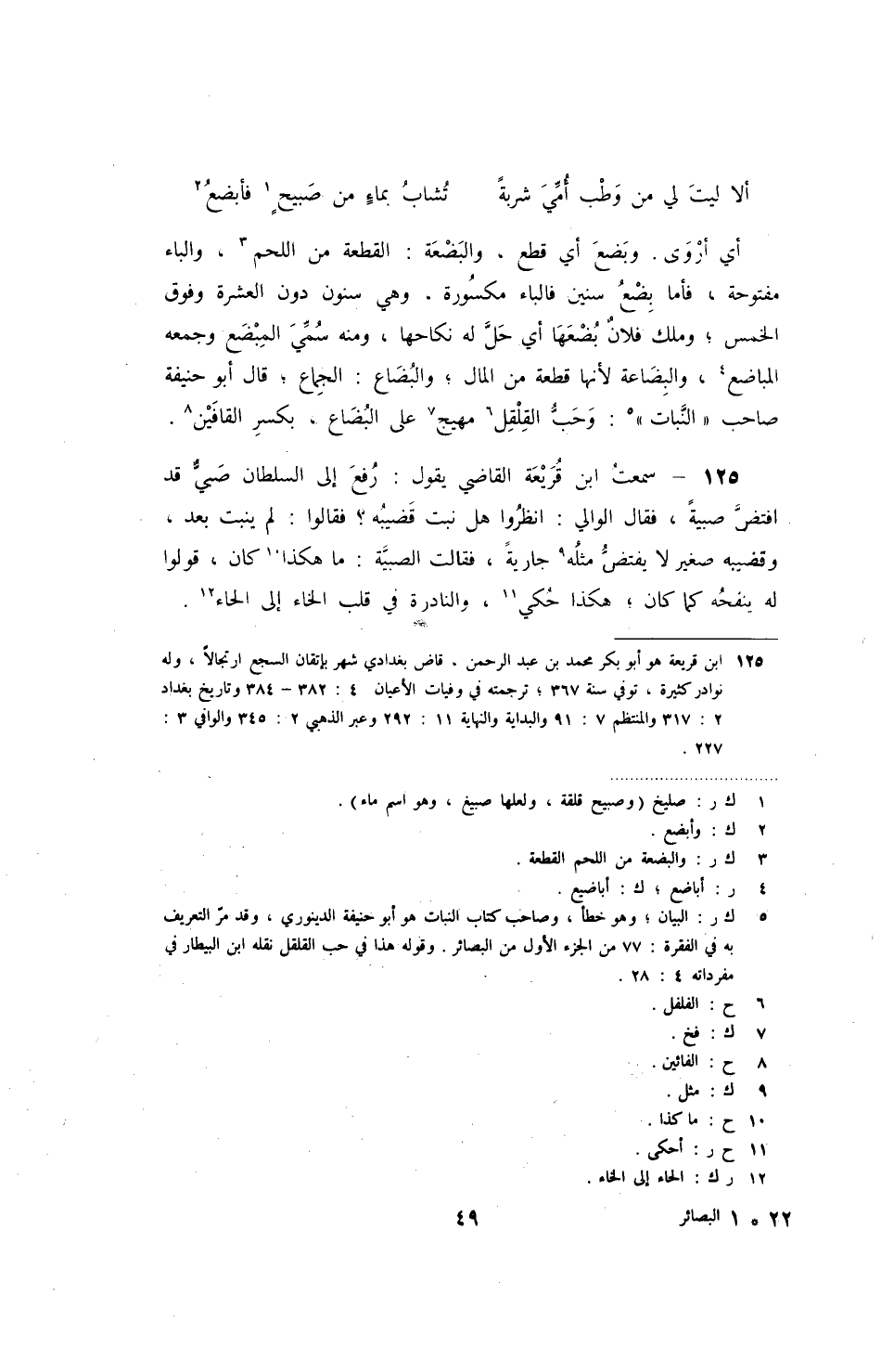 أي أروى. وبضع أي قطع، والبضعة: القطعة من اللحم، والباء مفتوحة، فأما بضع سنين فالباء مكسورة، وهي سنون دون العشرة وفوق الخمس؛ وملك فلان بضعها أي حل له نكاحها، ومنه سمي المبضع وجمعه المباضع، والبضاعة لأنها قطعة من المال؛ والبضاع: الجماع؛ قال أبو حنيفة صاحب النبات: وحب القلقل مهيج على البضاع، بكسر القافين.