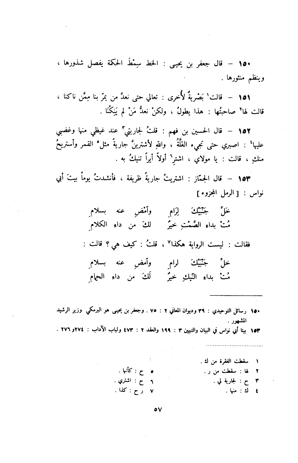قال الجماز: اشتريت جارية ظريفة، فأنشدت يوماً بيت أبي نواس: الرمل المجزوء