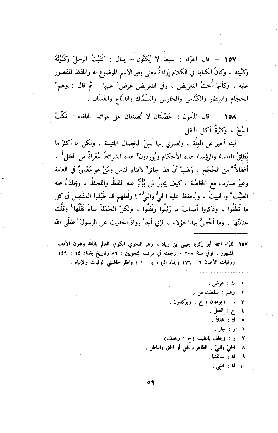 قال الفراء: سبعة لا يكنون - يقال: كنيت الرجل وكنوته وكنيته، وكأن الكناية في الكلام إرادة معنى بغير الأسم الموضوع له واللفظ المقصور عليه، وكأنها أخت التعريض، وفي التعريض غرض عليها - ثم قال: وهم الحجام والبيطار والكناس والحارس والسماك والدباغ والغسال.