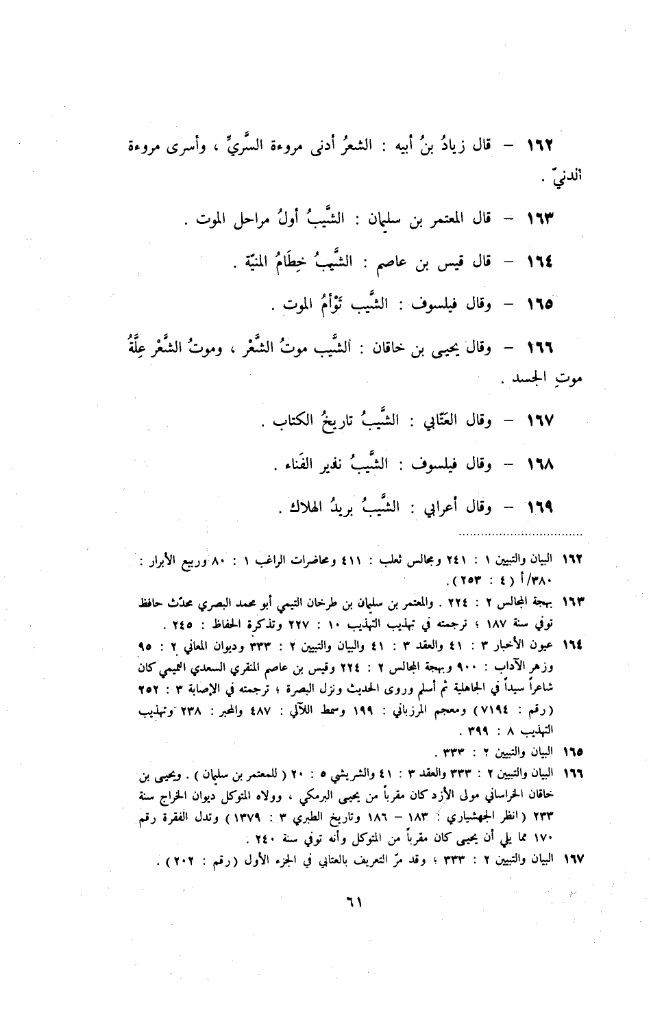 وقال يحيى بن خاقان: الشيب موت الشعر، وموت الشعر علة موت الجسد.