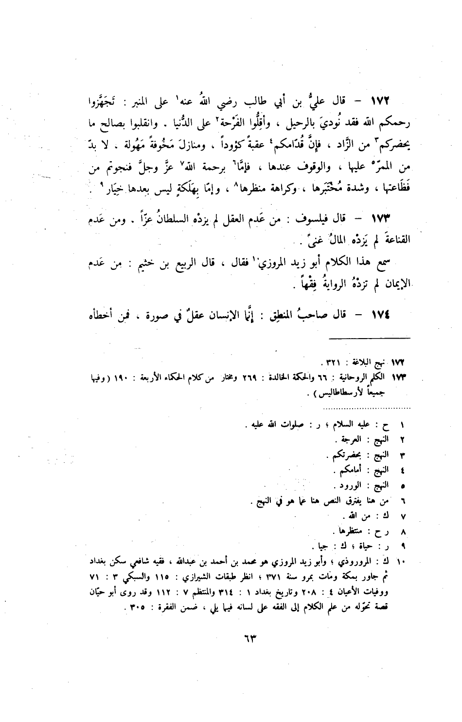 قال علي بن أبي طالب رضي الله عنه على المنبر: تجهزوا رحمكم الله فقد نودي بالرحيل، وأقلوا الفرحة على الدنيا، وانقلبوا بصالح ما يحضركم من الزاد، فإن قدامكم عقبة كؤوداً، ومنازل مخوفة مهولة، لا بد من الممر عليها، والوقوف عندها، فإما برحمة الله عز وجل فنجوتم من فظاعتها، وشدة مختبرها، وكراهة منظرها، وإما بهلكة ليس بعدها خيار.