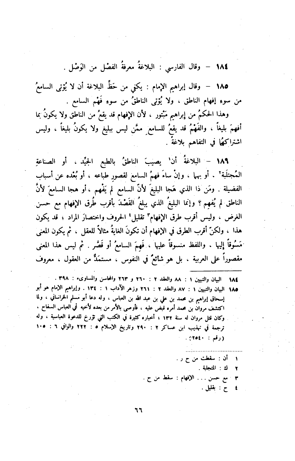 البلاغة أن يصيب الناطق بالطبع الجيد، أو الصناعة المجتلبة، أو بهما، وإن ساء فهم السامع لقصور طباعه، أو بعده عن أسباب الفضيلة. ومن ذا الذي هجا البليغ لأن السامع لم يفهم، أو هجا السامع لأن الناطق لم يفهم؟ وإنما البليغ الذي يبلغ القصد بأقرب طرق الإفهام مع حسن الغرض، وليس أقرب طرق الإفهام تقليل الحروف وأختصار المراد؛ قد يكون هذا، ولكن أقرب الطرق في الإفهام أن تكون الغاية مثالاً للعقل، ثم يكون المعنى مسوقاً إليها، واللفظ منسوقاً عليها، فهم السامع أو قصر. ثم ليس هذا المعنى مقصوراً على العربية، بل هو شائع في النفوس، مستمد من العقول، معروف