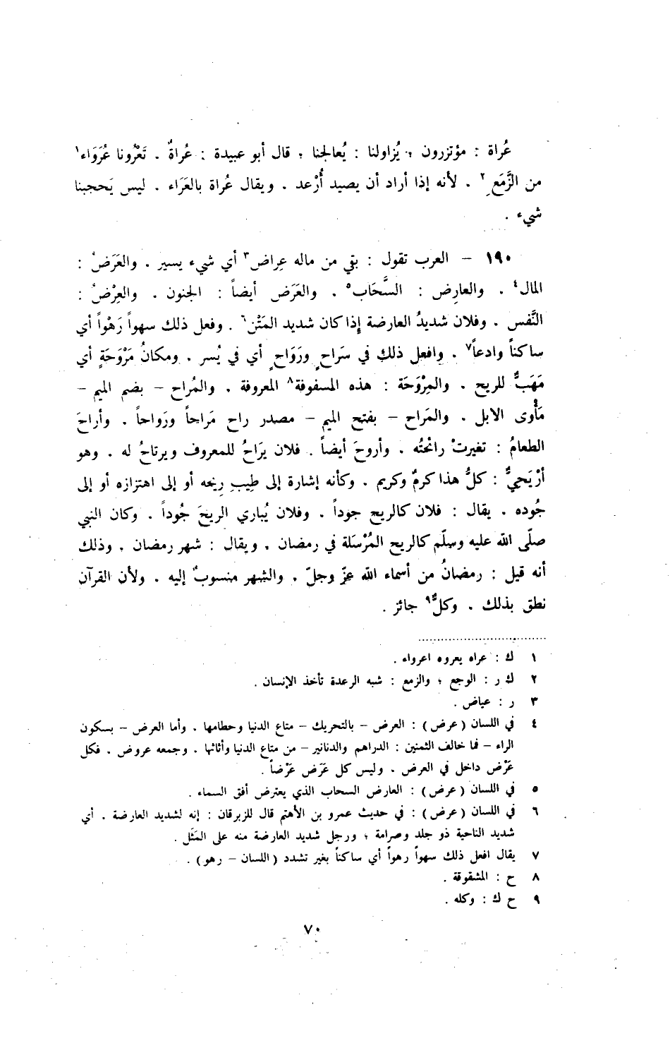 العرب تقول: بقي من ماله عراض أي شيء يسير، والعرض: المال، والعارض: السحاب، والعرض أيضاً: الجنون، والعرض: النفس، وفلان شديد العارضة إذا كان شديد المتن. وفعل ذلك سهواً رهواً أي ساكناً وادعاً، وأفعل ذلك في سراح ورواح أي في يسر، ومكان مروحة أي مهب للريح، والمروحة: هذه المسفوفة المعروفة، والمراح - بضم الميم - مأوى الأبل، والمراح - بفتح الميم - مصدر راح مراحاً ورواحاً، وأراح الطعام: تغيرت رائحته، وأروح أيضاَ. فلان يراح للمعروف ويرتاح له، وهو أريحي: كل هذا كرم وكريم، وكأنه إشارة إلى طيب ريحه أو إلى اهتزازه أو إلى جوده، يقال: فلان كالريح جوداً، وفلان يباري الريح جوداً، وكان النبي صلى الله عليه وسلم كالريح المرسلة في رمضان، ويقال: شهر رمضان، وذلك أنه قيل: رمضان من أسماء الله عز وجل، والشهر منسوب إليه، ولأن القرآن نطق بذلك، وكل جائز.