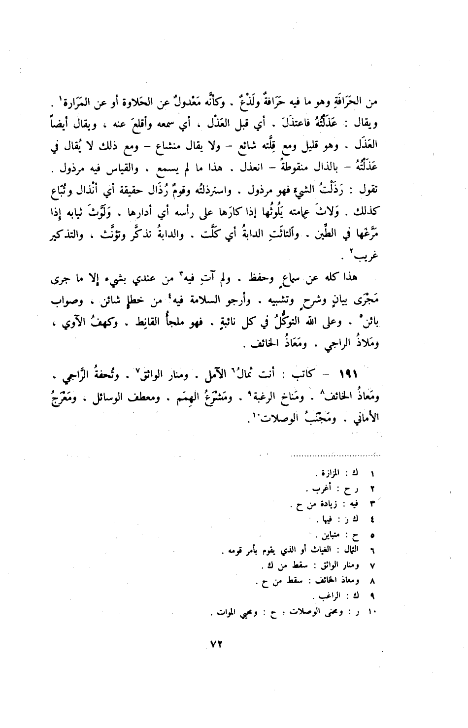 من الحرافة وهو ما فيه حرافة ولذع، وكأنه معدول عن الحلاوة أو عن المرارة. ويقال: عذلته فأعتذل، أي قبل العذل، أس سمعه وأقلع عنه، ويقال أيضاً العذل، وهو قليل ومع قلته شائع - ولا يقال منشاع - ومع ذلك لا يقال في عذلته - بالذال منقوطة - انعذل، هذا ما لم يسمع، والقياس فيه مرذول. تقول: رذلت الشيء فهو مرذول، واسترذلته وقوم رذال حقيقة أي أنذال وتباع كذلك. ولاث عمامته يلوثها إذا كارها على رأسه أي أدارها، ولوث ثيابه إذا مرغها في الطين، والتاثت الدابة أي كلت، والدابة تذكر وتؤنث، والتذكير غريب.
