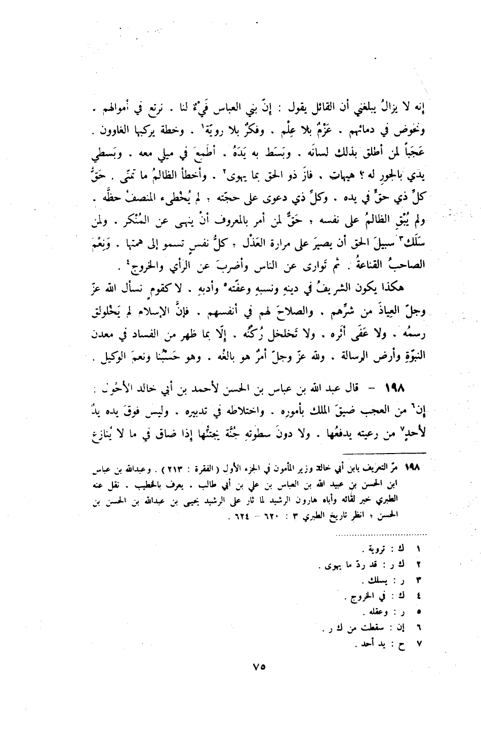 إنه لا يزال يبلغني أن القائل يقول: إن بن العباس فيء لنا، نرتع في أموالهم، ونخوض في دمائهم، عزم بلا علم، وفكر بلا روية، وخطة يركبها الغاوون. عجباً لمن أطلق بذلك لسانه، وبسط به يده، أطمع في ميلي معه، وبسطي يدي بالجور له؟ هيهات، فاز ذو الحق بما يهوى، وأخطأ الظالم ما تمنى، حق كل ذي حق في يده، وكل ذي دعوى على حجته؛ لم يخطىء المنصف حظه، ولم يبق الظالم على نفسه؛ حق لمن أمر بالمعروف أن ينهى عن المنكر، ولمن سلك سبيل الحق أن يصبر على مرارة العذل؛ كل نفس تسمو إلى هتمها، ونعم الصاحب القناعة، ثم توارى عن الناس وأضرب عن الرأي والخروج.