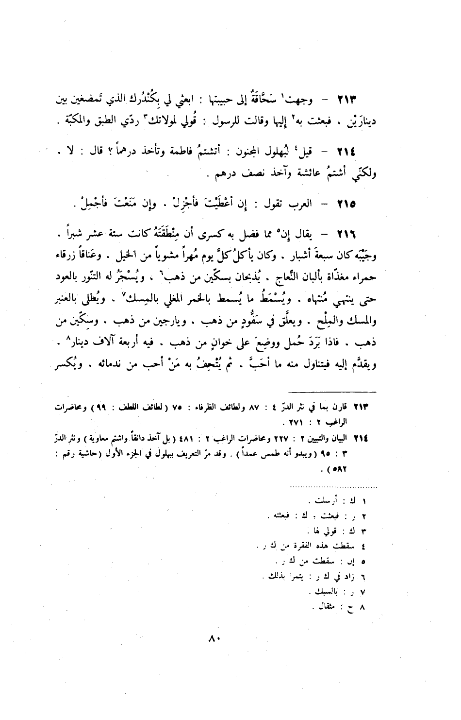 وجهت سحاقة إلى حبيبتها: ابعثي لي بكندرك الذي تمضغين بين دينارين، فبعثت به إليها وقالت للرسول: قولي لمولاتك ردي الطبق والمكبة.