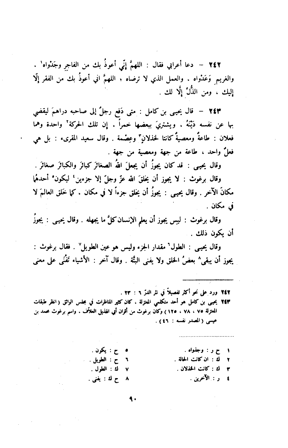 وقال يحيى: الطول مقدار الجزء وليس هو عين الطويل. فقال برغوث: يجوز أن يبقى بعض الخلق ولا يفنى البتة. وقال آخر: الأشياء تفنى على معنى