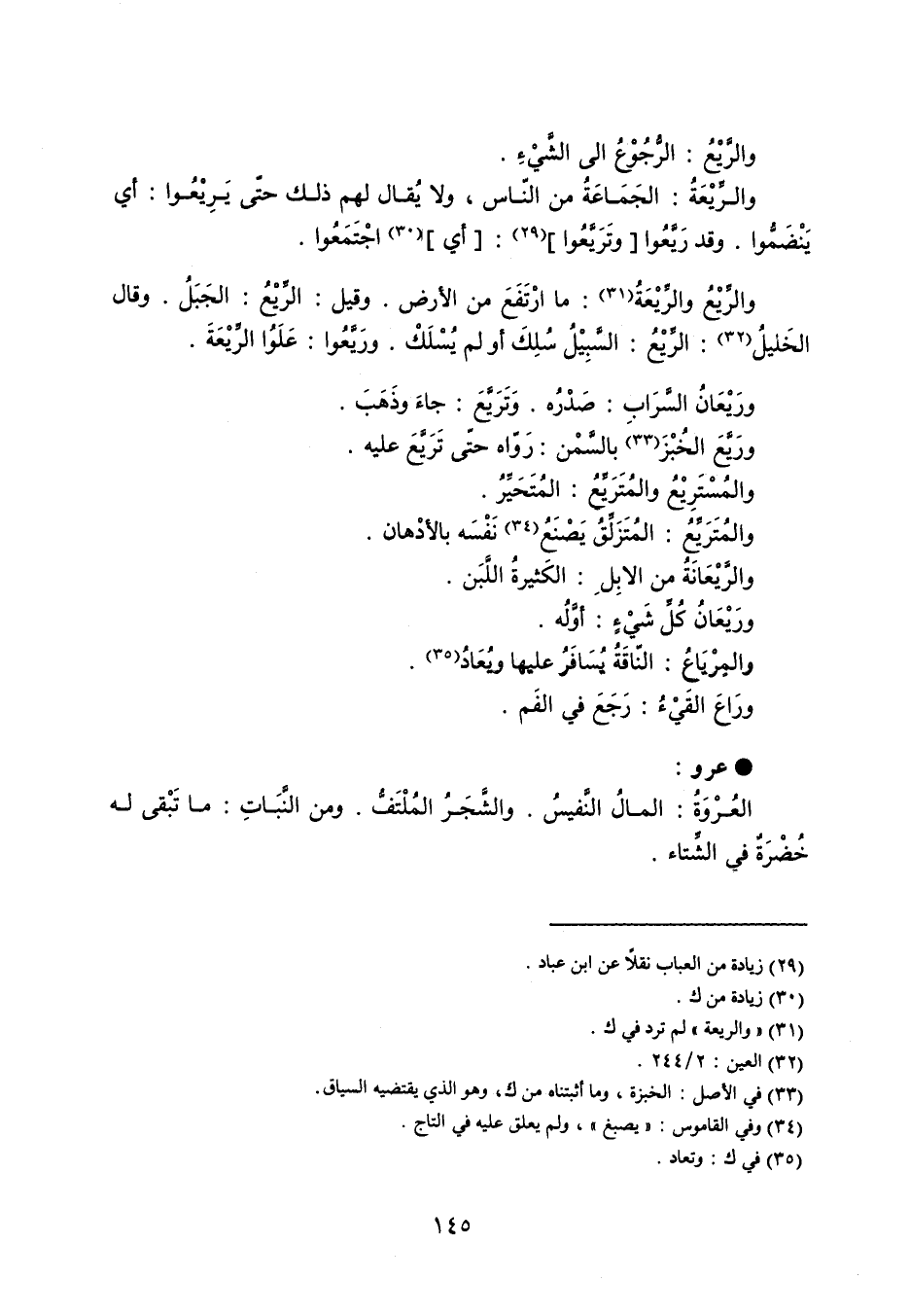 والرَّيْعُ : الرُّجُوْعُ إلى الشَّيْءِ . والرِّيْعَةُ : الجَمَاعَةُ من النّاس ، ولا يُقال لهم ذلك حتّى يَرِيْعُوا : أي يَنْضَمُّوا . وقد رَيَّعُوا وتَرَيَّعُوا : أي اجْتَمَعُوا . والرِّيْعُ والرِّيْعَةُ : ما ارْتَفَعَ من الأرض . وقيل : الرِّيْعُ : الجَبَلُ . وقال الخَليلُ : الرِّيْعُ : السَّبِيْلُ سُلِكَ أو لم يُسْلَكْ . ورَيَّعُوا : عَلَوُا الرِّيْعَةَ . ورَيْعَانُ السَّرَابِ : صَدْرُه . وَتَرَيَّعَ : جاءَ وذَهَب . ورَيَّعَ الخُبْزَ بالسَّمْن : رَوّاه حتّى تَرَيَّعَ عليه . والمُسْتَريْعُ والمُتَرَيِّعُ : المُتَحَيِّرُ . والمُتَرَيِّعُ : المُتَزَلِّقُ يَصْنَعُ نَفْسَه بالأدْهان . والرَّيعَانَةُ من الإبلِ : الكَثيرةُ اللَّبَن والرَيْعَانُ كُلِّ شَيْءٍ : أوَّلُه . والمِرْيَاعُ : النّاقَةُ يُسَافَرُ عليها ويُعَادُ . ورَاعَ القَيْءُ : رَجَعَ في الفَم . عرو العُرْوَةُ : المالُ النَّفيسُ . والشَّجَرُ المُلْتَفُّ . ومن النَّبَاتِ : ما تَبْقى له خُضْرَةٌ في الشِّتاء .