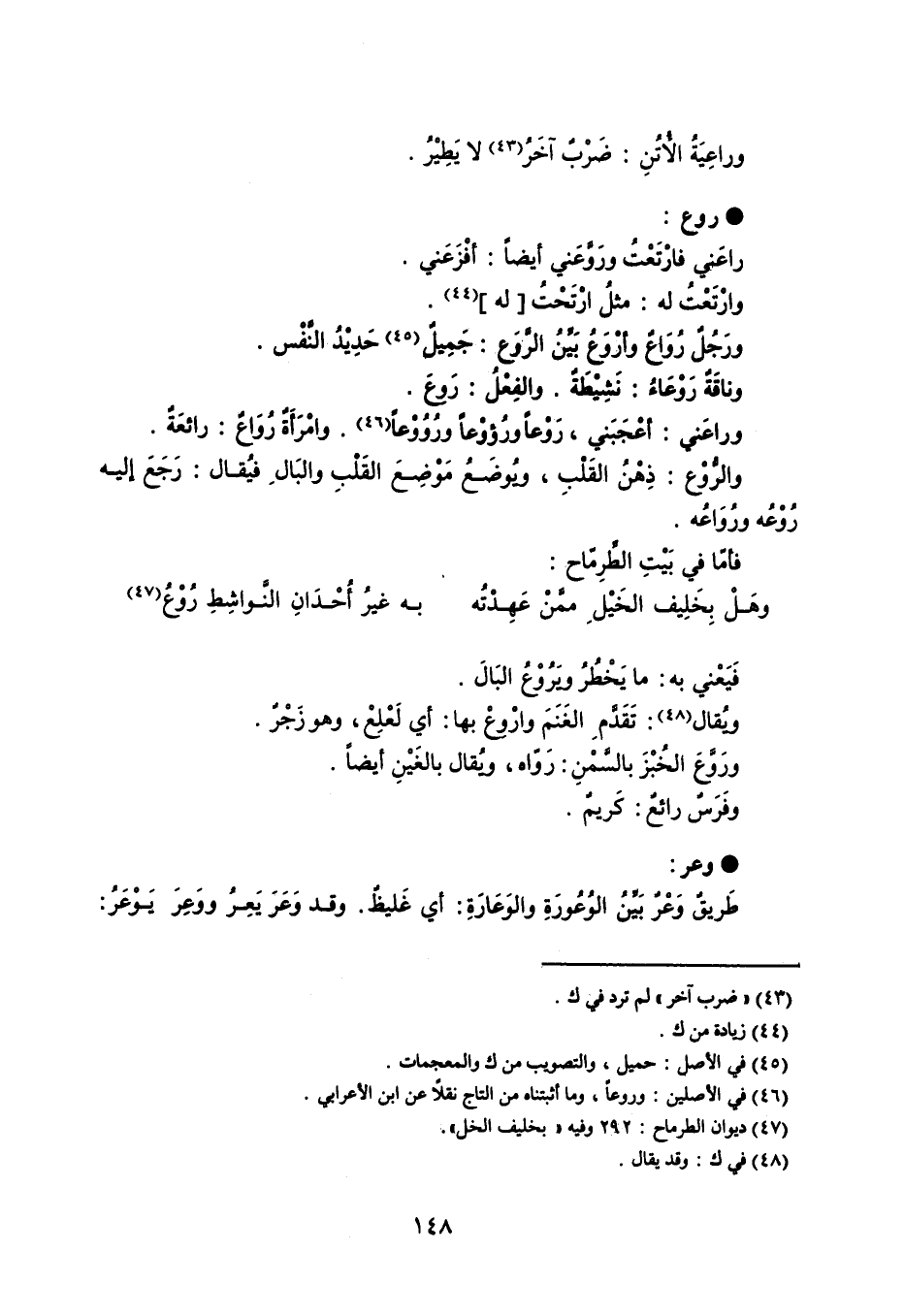 وراعِيَةُ الأُتُنِ : ضَرْبٌ آخَرُ لا يَطِيْرُ . روع راعَني فارْتَعْتُ ورَوَّعَني أيضاً : أفْزَعَني . وارْتَعْتَ له : مثلُ ارْتَحْتُ له . ورَجُلٌ رُوَاعٌ وأرْوَعُ بَيِّنُ الرَّوَع : جَمِيلٌ حَدِيْدُ النَّفْس . وناقَةٌ رَوْعَاءُ : نَشِيْطَةٌ . والفِعْلُ : رَوعَ . وراعَني : أعْجَبَني ، رَوْعاً ورُؤوْعاً ورُوُوعاً . وامْرَأَةٌ رُوَاعٌ : رائعَةٌ . والرُّوْع : ذِهْنُ القَلْبِ ، ويُوضَعَ ومَوْضِعْ القَلْبِ والبَالِ فيُقال : رَجَعَ إليه رُوْعُه ورُوَاعُه . فأمّا في بَيْتِ الطِّرِمّاح : وهَلْ بِخَلِيف الخَيْلِ ممَّنْ عَهِدْتُه . . . به غيرُ أُحْدَانِ النَّواشِطِ رُوْعُ فَيَعْني به : ما يَخْطُرُ ويَرُوْعُ البَالَ . ويُقال : تَقَدَّمِ الغَنَمَ وارْوعْ بها : أي لَعْلِعْ ، وهو زَجْرٌ . ورَوَّعَ الخُبْزَ بالسَّمْنِ : رَوّاه ، ويُقال بالغَيْنِ أيضاً . وفَرَسٌ رائعٌ : كَريمٌ . ؟ وعر طَريقٌ وَعْرٌ بَيَّنُ الوُعُورَةِ والوَعَارَةِ : أي غَليظٌ . وقد وَعَرَ يَعِرُ ووَعِرَ يَوْعَرُ :