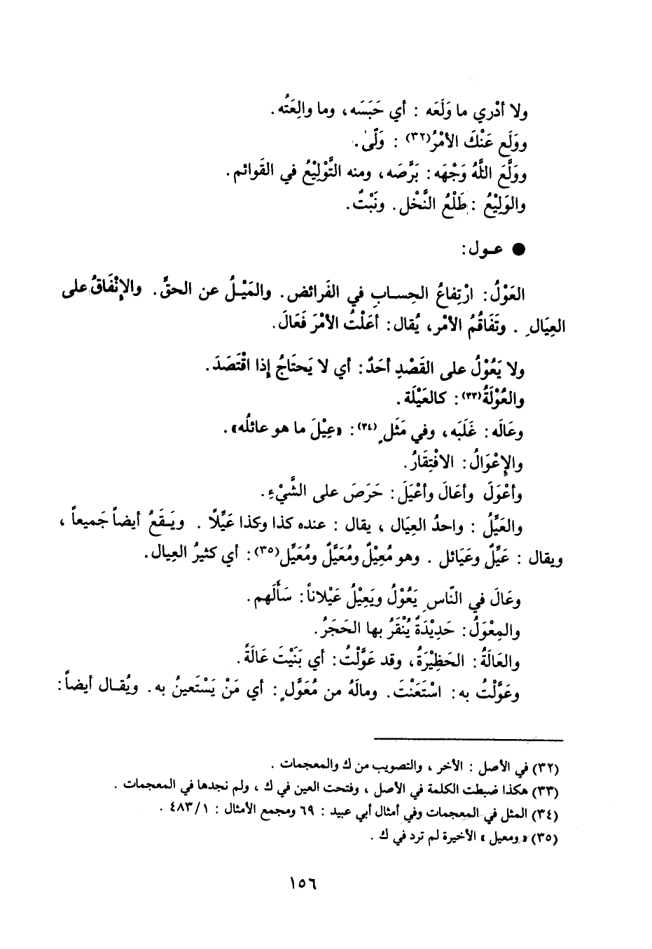ولا أدْري ما وَلَعه : أي حَبَسَه ، وما والِعَتُه . ووَلَعَ عَنْكَ الأمْرُ : وَلّى . ووَلَّعَ اللهُ وَجْهَه : بَرَّصَه ، ومنه التَّوْلِيْعُ في القَوائم . والوَلِيْعُ : طَلْعُ النَّخْل . ونَبْتٌ . عول العَوْلُ : ارْتِفاعُ الحِسابِ في الفَرائض . والمَيْلُ عن الحقِّ . والإِنْفَاقُ على العِيَالِ . وتَفَاقُمُ الأمْر ، يُقال : أعَلْتُ الأمْرَ فَعَالَ . ولا يَعُوْلُ على القَصْدِ أحَدٌ : أي لا يَحتَاجُ إِذا اقْتَصَدَ . والعُوْلَةُ : كالعَيْلَة . وعَالَه : غَلَبَه ، وفي مَثَلٍ : ' عِيْلَ ما هو عائلُه ' والإِعْوَالُ : الافْتِقَارُ . وأعْوَلَ وأعَالَ وأعْيَلَ : حَرَصَ على الشَّيْءِ . والعَيِّلُ : واحدُ العِيَال ، يُقال : عنده كذا وكذا عَيِّلاً . ويَقَعُ أيضاً جَميعاً . ويُقال : عَيِّلٌ وعَيَائل . وهو مُعِيْلٌ ومَعَيَّل : أي كثيرُ العِيال . وعَالَ في النّاسِ يَعُوْلُ ويَعِيْلُ عَيْلاناً : سَأَلَهم . والمِعْوَلُ : حَدِيْدَةٌ يُنْقَرُ بها الحَجَرُ . والعَالَةُ : الحَظِيْرَةُ ، وقد عَوَّلْتُ : أي بَنَيْتَ عَالَةً . وعَوَّلْتُ به : اسْتَعَنْتَ . ومالَهُ من مُعَوَّلٍ : أي مَنْ يَسْتَعينُ به . ويُقال أيضاً :