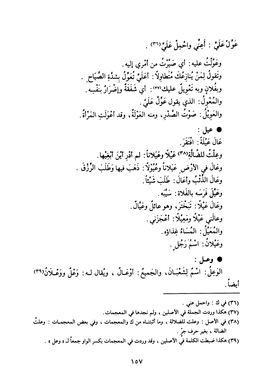 عَوِّلَْ عَلَيَّ : أَعِنِّي واحْمِلْ عَلَيَّ . وعَوَّلْتُ عليه : أي صَيَّرْتُ من أمْري إليه . وتَقولُ لِمَنْ يُنازِعُكَ مُتَطاوِلاً : أعَلَيَّ تُعَوِّلُ بِشدَّةِ الصِّيَاحِ . وبفُلانٍ وبه تَعْوِيلٌ عليك : أي شَفَقَةٌ وإضْرَارٌ بنَفْسِه . والمُعْوِلُ : الذي يقول عَوِّلْ عَلَيَّ . والعَوِيْلُ صَوْتُ الصَّدْرِ ، ومنه العَوْلَةُ ، وقد أعْوَلَتِ المَرْأةُ . عيل عَالَ عَيْلَةً : افْتَقَرَ . وعِلْتُ للضَّالَّةِ عَيْلاً وعَيَلاناً : لم أدْرِ أيْنَ أبْغِيْها . وعَالَ في الأرْضِ عَيَلاناً وعُيُوْلاً : ذَهَبَ فيها وطَلَبَ الرِّزْقَ . وعَالَ الذِّئْبُ وأعَالَ : طَلَبَ شَيْئاً . وعَيَّلَ فَرَسَه بالفَلاة : سَيَّبَه . وعَالَ عَيْلاً : تَبَخْتَرَ ، وهو عائلٌ وعَيَّالٌ . وعالَني عَيْلاً ومَعِيْلاً : أعْجَزَني . والمُعَيَّلُ : المُسَاءُ غِذاؤه . وعَيْلانُ : اسْمُ رَجُلٍ . وعل الوَعِلُ : اسْمٌ لِشَعْبَانَ ، والجَميعُ : أوْعَالٌ ، ويُقال له : وَعْلٌ ووَعْلاَنُ أيضاً .