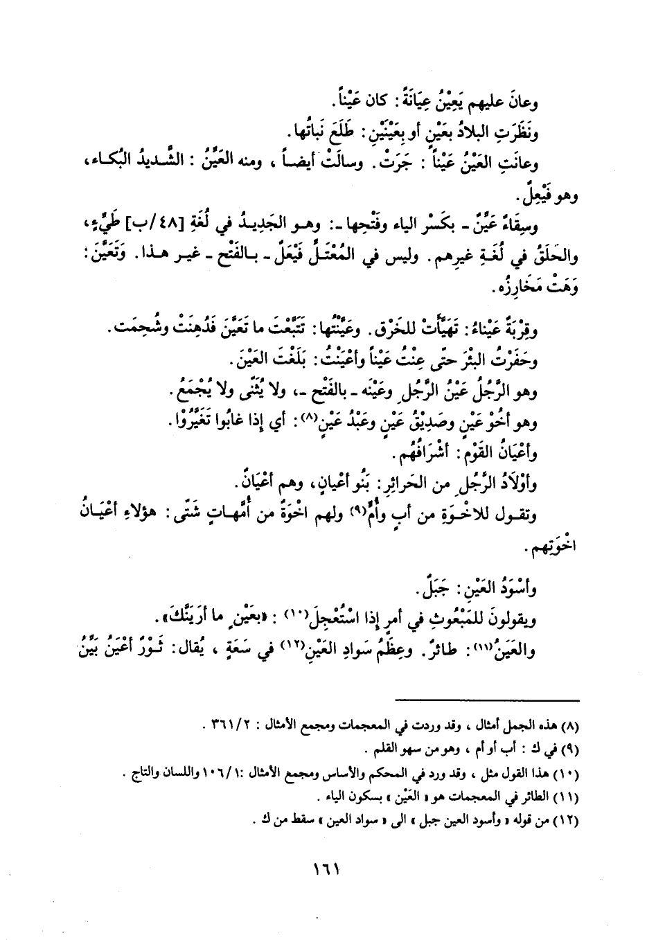 وعانَ عليهم يعِيْنُ عِيَانَةً : كان عَيْناً . ونَظَرَتِ البلادُ بِعَيْنٍ أو بِعَيْنَيْنِ : طَلَعَ نَباتُها . وعانَتِ العَيْنُ عَيْناً : جَرَتْ . وسالَتْ أيضاً ، ومنه العَيِّنُ : الشَّديدُ البُكاء ، وهو فَيْعِلٌ . وسِقَاءٌ عَيِّنٌ - بكَسْر الياء وفَتْحِها - : وهو الجَدِيدُ في لُغَةِ طَيِّءٍ ، والحَلَقُ في لُغَةِ غيرِهم . وليس في المُعْتَلِّ فَيْعَلٌ - بالفَتْح - غير هذا . وَتَعَيَّنَ : وَهَتْ مَخَارِزُه . وقِرْبَةٌ عَيْناءُ : تَهَيَّأَتْ للخَرْق . وعَيَّنْتُها : تَتَبَّعْتَ ما تَعَيَّنَ فَدُهِنَتْ وشُحِمَت . وحَفَرْتُ البئْرَ حتّى عِنْتُ عَيْناً وأعْيَنْتُ : بَلَغْتَ العَيْنَ . وهو الرَّجُلُ عَيْنُ الرَّجُلِ وعَيْنَه - بالفَتْح - ولا يُثَنّى ولا يُجْمَعُ . وهو أخُوْ عَيْنٍ وصَدِيْقُ عَيْنٍ وعَبْدُ عَيْنٍ : أي إِذا غابُوا تَغَيَّرُوْا . وأَعْيَانُ القَوْم : أشْرَافُهُم . وأوْلاَدُ الرَّجُلِ من الحَرائِر : بَنُو أعْيانٍ ، وهم أعْيَانٌ . وتقول للأخْوَةِ من أبٍ وأُمٍّ ولهم أخْوَةٌ من أُمَّهاتٍ شَتّى : هؤلاءِ أعْيَانُ إخْوَتِهم . وأسْوَدُ العَيْنِ : جَبَلٌ . ويقولونَ للمَبْعُوثِ في أمرٍ إِذا اسْتُعْجِلَ : ' بعَيْنٍ ما أرَيَنَّكَ ' . والعَيَنُ : طائرٌ . وعِظَمُ سَوادِ العَيْنِ في سَعَةٍ ، يُقال : ثَوْرٌ أعْيَنُ بَيِّنُ