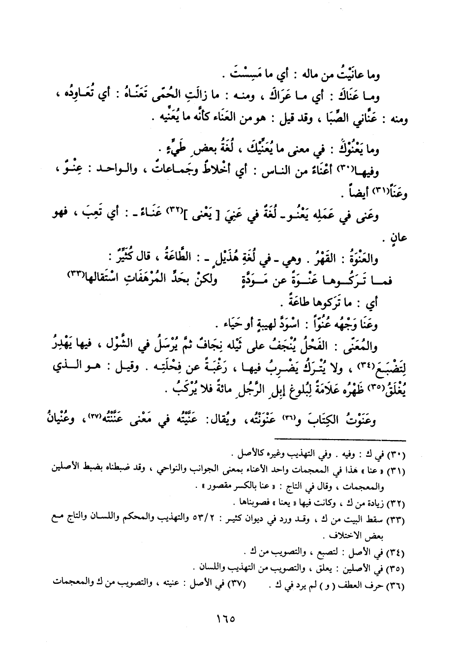 وما عانَيْتُ من ماله : أي ما مَسِسْتَ . وما عَنَاكَ : أي ما عَرَاكَ ، ومنه : ما زالَتِ الحُمّى تَعَنّاهُ : أي تُعَاوِدُه ، ومنه : عَنَّاني الصِّبَا ، وقد قيل : هو من العَنَاء كأنَّه ما يُعَنِّه . وما يَعْنُوْك : في معنى ما يُعَنِّيْك ، لُغَةُ بعَضِ طَيِّءٍ . وفيها أعْنَاءٌ من الناس : أي أخْلاطٌ وجَماعاتٌ ، والواحد : عِنْوٌ ، وَعَنَاً أيضاً . وعَنى في عَمَلِه يَعْنُو - لُغَةٌ في عَنِيَ يَعْني عَنَاءٌ - : أي تَعِبَ ، فهو عانٍ . والعَنْوَةُ : القَهْرُ . وهي - في لُغَةِ هُذَيْلٍ - : الطَّاعَةُ ، قال كُثَيِّرٌ : فما تَرَكوها عَنْوةً عن مَوَدَّةٍ . . . ولكنْ بحَدِّ المُرْهَفَاتِ اسْتَقالها . أي ما تَرَكوها طاعَةً . وعَنَا وَجْهُه عُنُوّاً : اسْوَدَّ لهيبةٍ أو حَيَاء . والمُعَنّى : الفَحْلُ يُنْجَفُ على ثَيْله نِجَافٌ ثمَّ يُرْسَلُ في الشَّوْل ، فيها يَهْدِرُ لِتَضْبَعَ ، ولا يُتْرَكُ يَضْرِبُ فيها ، رَغْبَةً عن فِحْلَتِه . وقيل : هو الذي يُغْلَقُ ظَهْرُه عَلاَمَةً لِبُلوغ إبِلِ الرَّجِل مائةً فلا يُرْكَبُ . وعَنَوْتُ الكِتَابَ وعَنْوَنْتُه ، ويُقال : عَنيَّتْهُ في مَعْنى عَنَّنْتُه ، وعُنْيانُ