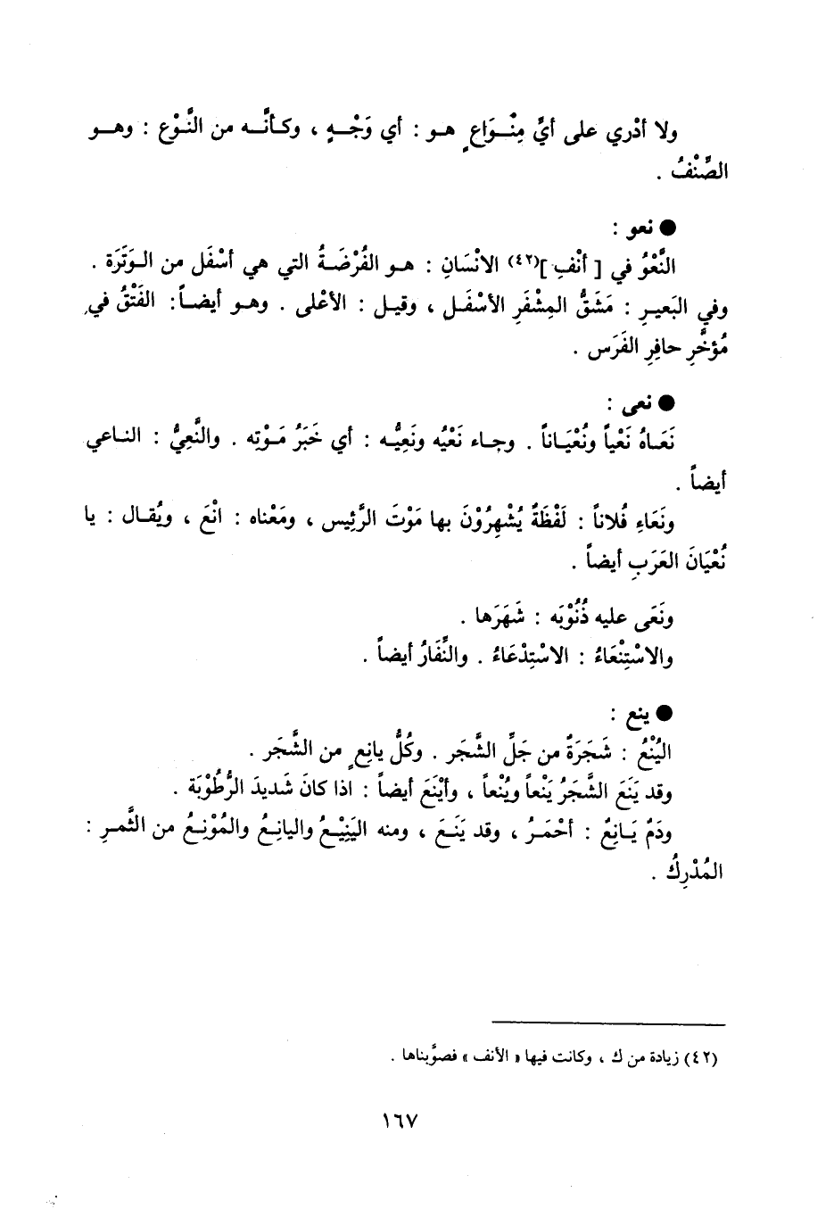 ولا أدْري على أيِّ مِنْوَاعٍ هو : أي وَجْهٍ ، وكأنَّه من النَّوْع : وهو الصِّنْفُ . نعو النَّعْوُ في أنْفِ الإنْسَانِ : هو الفُرصَةُ التي هي أسْفَل من الوَتَرَة . وفي البَعيرِ : مَشَقُّ المِشْفَرِ الأسْفَل ، وقيل : الأعْلى . وهو أيضاً : الفَتْقُ في مُؤخرِ حافِرِ الفَرَس . نعى نَعَاهُ نَعْياً ونُعْيَاناً . وجاء نَعْيُه ونَعِيُّه : أي خَبَرُ مَوْتِه . والنَّعِيُّ : الناعي أيضاً . ونَعَاءِ فُلاناً : لَفْظَةٌ يُشْهِرُوْنَ بها مَوْتَ الرَّئِيس ، ومَعْناه : انْعَ ، ويُقال : يا نُعْيَانَ العَرَبِ أيضاً . ونَعَى عليه ذُنُوْبَه : شَهَرَها . والاسْتِنْعَاءُ : الاسْتِدْعَاءُ . والنِّفَارُ أيضاً . ينع اليُنْعُ : شَجَرَةٌ من جَلِّ الشَّجَر . وكُلِّ يانِعٍ من الشَّجَر . وقد يَنَعَ الشَّجَرُ يَنْعاً ويُنْعاً ، وأيْنَعَ أيضاً : إذا كانَ شَديدَ الرُّطُوْبَة . ودَمٌ يَانِعٌ : أحْمَرُ ، وقد يَنَعَ ، ومنه اليَنِيْعُ واليانِعُ ولمُوْنِعُ من الثَّمرِ : المُدْرِكُ .