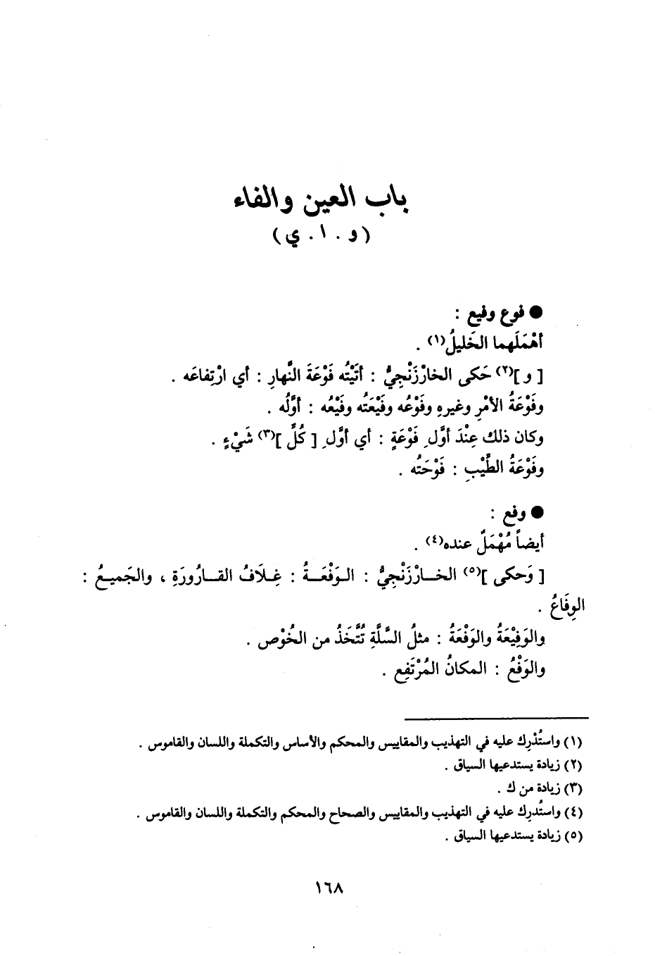 و . ا . ي . فوع وفيع أهْمَلهما الخَليلُ . و حَكى الخارْزَنْجِيُّ : أتَيْتُه فَوْعَةَ النَّهارِ : أي ارْتِفاعَه . وفَوْعَةُ الأمْرِ وغيرهِ وفَوْعُه وفَيْعُه : أوَّلُه . وكان ذلك عِنْدَ أوَّلِ فَوْعَةٍ : أي أوَّلِ كُلِّ شَيْءٍ . وفُوْعَةُ الطَّيْبِ : فُوْحَتُه . وفع أيضاً مُهْمَلٌ عنده . و حَكى الخارْزَنْجِيُّ : الوَفْعَةُ : غِلاَفُ القارُورَةِ ، والجَميعُ : الوِفَاعُ . والوَفِيْعًةُ والوَفْعَةُ : مثلُ السَّلَّةِ تُتَّخَذُ من الخُوْص . والوَفْعُ : المكانُ المُرْتَفِع .