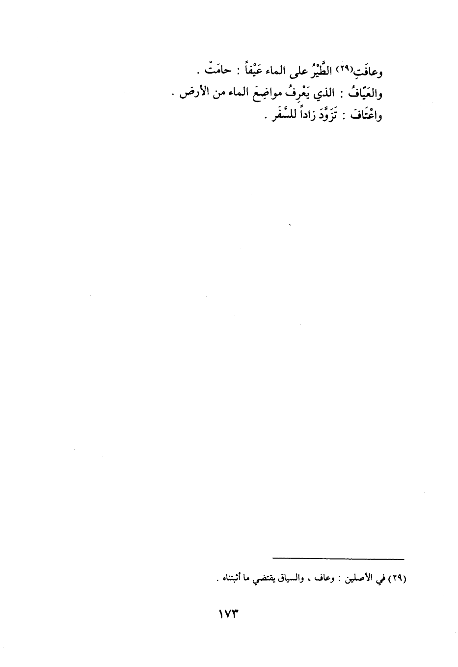 وعافَتِ الطَّيْرُ على الماء عَيْفاً : حامَتْ . والعَيّافُ : الذي يَعْرِفُ مواضِعَ الماء من الأرض . واعْتَافَ : تَزَوَّدَ زاداً للسَّفَر .