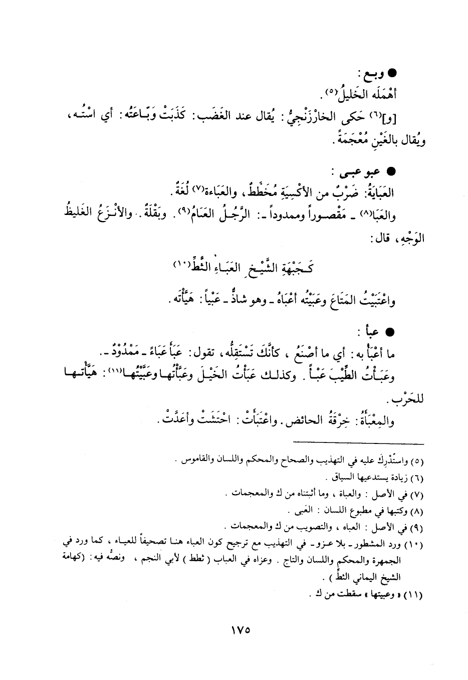وبع أهْمَله الخَليل . و حَكى الخارْزَنْجِيُّ : يُقال عند الغَضَب : كَذَبَتْ وَبّاعَتُه : أي اسْتُه ، ويُقال بالغَيْنِ مُعْجَمَةً . عبو عبى العَبَايَةُ : ضَرْبٌ من الأكْسِيَةِ مُخَطَّطٌ ، والعَبَاءة لُغَةٌ . والعَبَا - مَقْصوراً وممدوداً - : الرَّجُلُ العَبَامُ . وبَقْلَةٌ . والأنْزَعُ الغَليظُ الوَجْهِ ، قال : كَجَبْهَةِ الشَّيْخِ العَبَاءِ الثَّطِّ . واعْتَبَيْتُ المَتَاعَ وعَبَيْتُه أعْبَاهُ - وهو شاذٌ - عَبْياً : هَيَّأْتَه . عبأ ما أعْبَأُ به : أي ما أصْنَعُ ، كأنَّكَ تَسْتَقِلُّه ، تقول : عَبَأَ عَبَاءً - مَمْدُوْدٌ - . وعَبَأْتُ الطِّيْبَ عَبْأً . وكذلك عَبَأْتُ الخَيْلَ وعَبَّأْتُها وعَبَّيْتُها : هَيَّأْتها للحَرْب . والمِعْبَأَةُ : خِرقَةُ الحائض . واعْتَبَأَتْ : احْتَشَتْ وأعَدَّتْ .