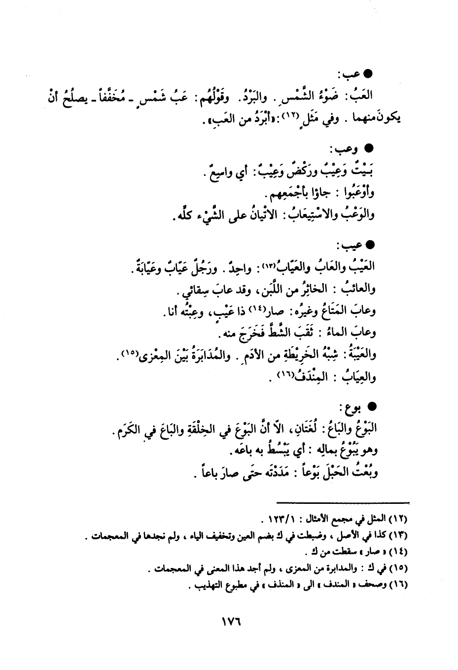 عب العَبُ : ضَوْءَ الشَّمْسِ . والبَرْدُ . وقَوْلُهُم : عَبُ شَمْسٍ - مُخَفَّفاً - يصلُحُ أنْ يكونَ منها . وفي مَثَلٍ : ' أبْرَدُ من العبِ ' . وعب بَيْتٌ وَعِيْبٌ ورَكْضٌ وَعِيْبٌ : أي واسِعٌ . وأوْعَبُوا : جاؤا بأجْمَعِهم . والوَعْبُ والاسْتِعَابُ : الأتْيانُ على الشَّيْء كلِّه . عيب العَيْبُ والعَابُ والعَيّاب : واحِدٌ . ورَجُلٌ عَيّابٌ وعَيّابَةٌ . والعائبُ : الخاثِرُ من اللَّبَن ، وقد غاب سِقائي . وعابَ المَتَاعُ وعيرُه : صار ذا عِيْبٍ ، وعِبْتُه أنا . وعابَ الماءُ : ثَقَبَ الشَّطَّ فَخَرَجَ منه . والعَيْبَةُ : شِبْهُ الخَرِيْطَةِ من الأدَمِ . والمُدَابَرَة بَيْنَ المِعْزى . والعِيَابُ : المِنْدَفُ . بوع البَوْعُ والبَاعُ : لُغَتَانِ ، إلاّ أنَّ البَوْعَ في الخِلْقَةِ والبَاعَ في الكَرَم . وهو يَبُوْعُ بمالِه : أي يَبْسُطُ به باعَه . وبُعْتُ الحَبْلَ بَوْعاً : مَدَدْتَه حتَى صارَ باعاً .