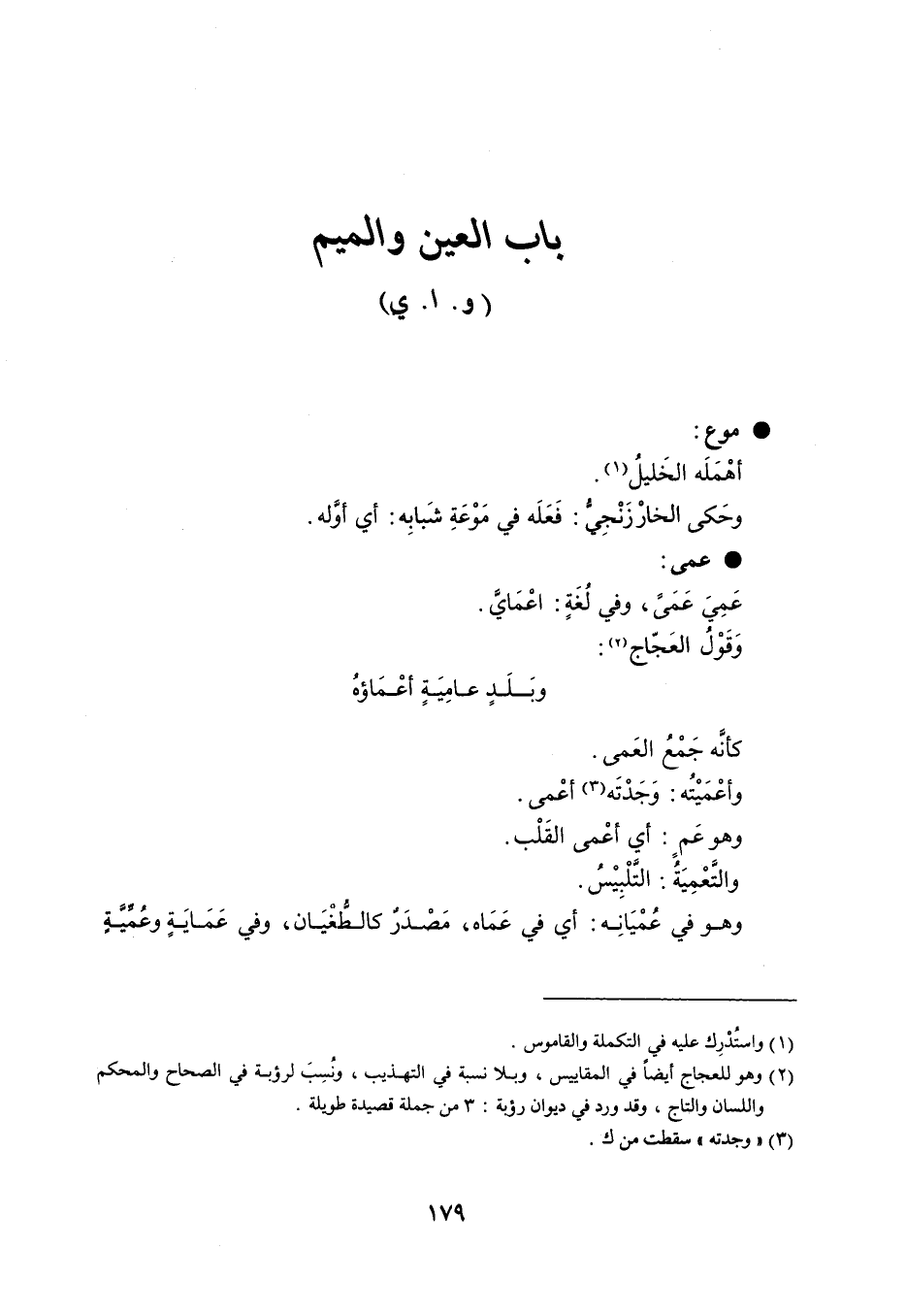 و . ا . ي . موع أهْمَله الخَليلُ . و حَكى الخارْزَنْجِيُّ : فَعَلَه في مَوْعَةِ شَبابِه : أي أوَّله . عمى عَمِيَ عَمَىً ، وفي لُغَةٍ : اعْمَايَّ . وَقَوْلُ العَجّاج : وبَلَدٍ عامِيَةٍ أعْمَاؤهُ . كأنَّه جَمْعُ العَمى . وأعْمَيْتُه : وَجَدْتَه أعْمى . وهو عَمٍ : أي أعْمى القَلْب . والتَّعْمِيَةُ : التَّلْبِيْسُ . وهو في عُمْيَانِه : أي في عَمَاه ، مَصْدرٌ كالطُّغْيَان ، وفي عَمَايَةٍ وعُمِّيَّةٍ