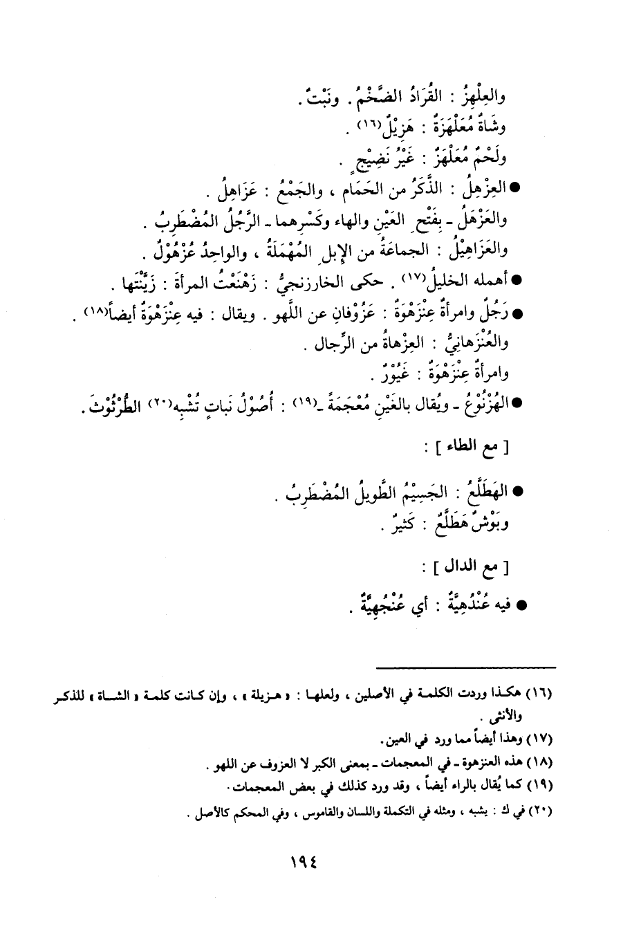 العِلْهِزُ : القُرَادُ الضَّخْمُ . ونَبْتٌ . وشَاةٌ مُعَلْهَزَةٌ : هَزِيْلٌ . ولَحْمٌ مُعَلْهَزٌ غَيرُ نَضِيجٍ العِزْهِلُ الذَّكَرُ من الحَمَام ، والجَمْعُ عَزَاهِلُ . والعَزْهَلُ بفتح العَيْن والهاء وكسرِهما - الرَّجُلُ المُضْطَرِبُ . والعَزَاهِيْلُ الجماعَةُ من الإِبلِ المُهْمَلَةُ ، والواحِدُ عُزْهُوْلٌ . أهْمَله الخَليل . حَكى الخارْزَنْجِيُّ زَهْنَعْتُ المرأةَ زَيَّنْتَها . رَجُلٌ وامرأةٌ عِنْزَهُوَةٌ عَزُوْفانِ عن اللَّهو . ويُقال فيه عِنْزَهْوَةٌ أيضاً . والعُنْزَهانِيُّ العِزْهاةُ من الرِّجال . وامرأةٌ عِنْزَهْوَةٌ غَيُوْرٌ . الهُزْنُوْعُ - ويُقال بالغَيْنِ مُعْجَمَةٌ - أُصُوْلُ نَباتٍ تُشْبِه الطُّرْثُوْثَ . مع الطاء : الهَطَلَّعُ : الجَسِيْمُ الطَّويلُ المُضْطَرِبُ . وبَوْشٌ هَطَلَّعٌ : كَثيرٌ . مع الدال : فيه عُنْدُهِيَّةٌ أي عُنْجهِيَّةٌ .