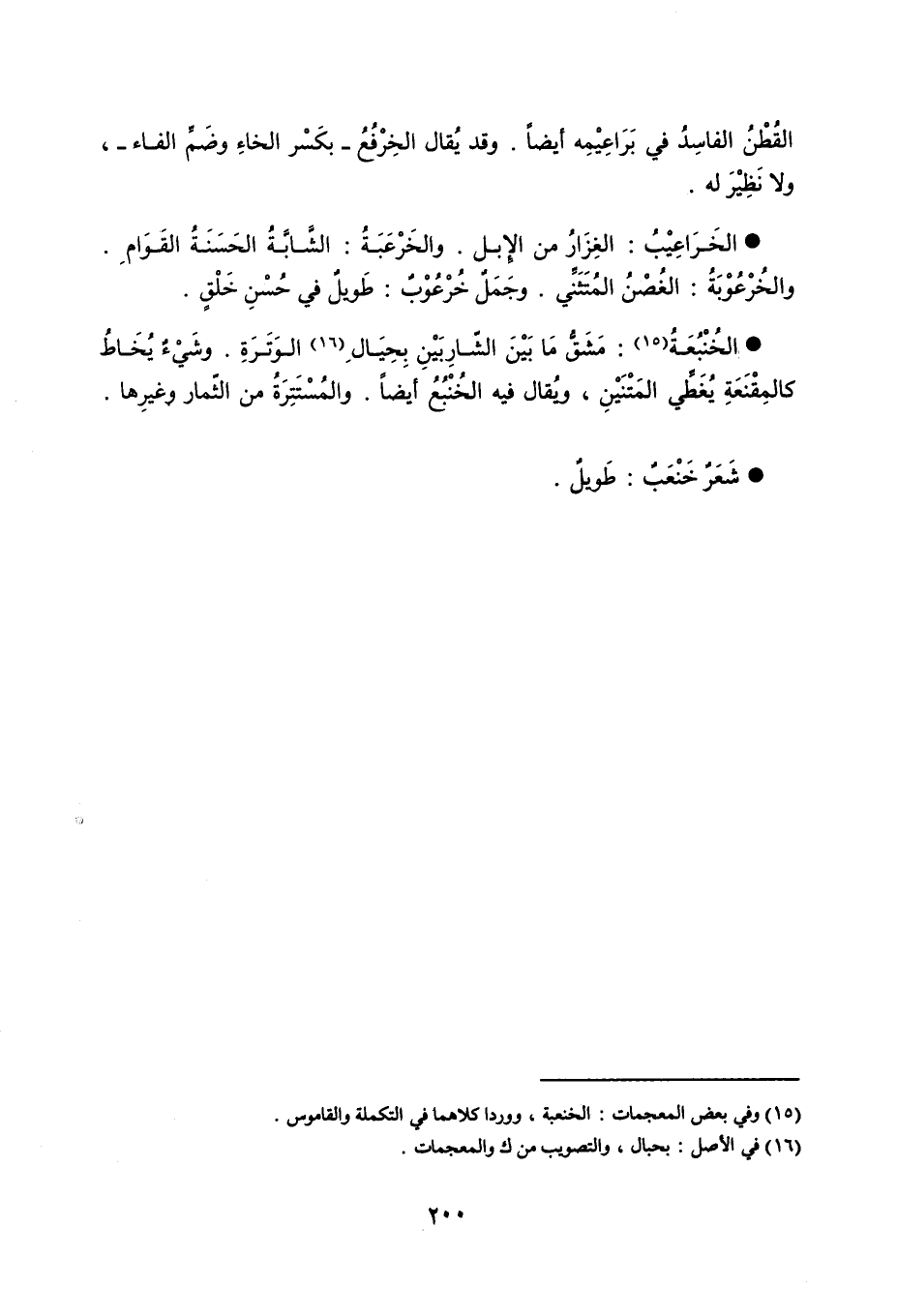القُطْنُ الفاسِدُ في بَرَاعِيْمِه أيضاً . وقد يُقال الخِرْفُعُ - بكَسْر الخاءِ وضَمِّ الفاء - ولا نَظِيْرَ له . الخَرَاعِيْبُ الغِزَارُ من الإِبل . والخَرْعَبَةُ الشَّابَّةُ الحَسَنَةُ القَوَامِ . والخُرْعُوْبَةُ الغُصْنُ المُتَثَنِّي . وجَمَلٌ خُرْعُوْبٌ طَويلٌ في حُسْنِ خَلْقٍ . الخُنْبُعَة مَشَقُّ مَا بَيْنَ الشّارِبَيْنِ بِحِيَالِ الوَتَرَةِ . وشَيْءٌ يُخَاطُ كالمِقْنَعَةِ يُغَطِّي المَتْنَيْنِ ، ويُقال فيه الخُنْبُعُ أيضاً . والمُسْتَتِرَةُ من الثّمار وغيرِها . شَعَرٌ خَنْعَبٌ طَويلٌ .