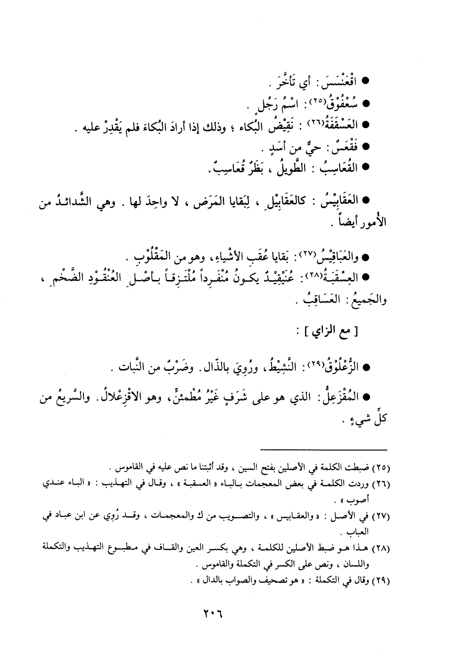 اقْعَنْسَسَ أي تَأخَّرَ . سُعْفُوْقُ اسْمُ رَجُلٍ . العَسْقَفَةُ نَقِيْضُ البُكاء ، وذلك إذا أرادَ البُكاءَ فلم يَقْدِرْ عليه . فَقْعَسٌ حيٌّ من أسَدٍ . القُعَاسِبُ الطَّويلُ ، بَظَرٌ قُعَاسِبٌ . العَقَابِيْسُ كالعَقَابِيْلِ ، لِبَقايا المَرَض ، لا واحدَ لها . وهي الشَّدائدُ من الأُمور أيضاً . والعَبَاقِيْسُ بَقايا عُقَبِ الأشْياءِ ، وهو من المَقْلُوْبِ . العِسْقَبَةُ عُنَيْقِيْدٌ يكونُ مُنْفَرِداً مُلْتَزِقاً بأصْلِ العُنْقُوْدِ الضَّخْمِ ، والجَميعُ العَسَاقِبُ . مع الزاي : الزُّعْلُوْقُ النَّشِيْطُ ، ورُوِيَ بالذَال . وضَرْبٌ من النَّبات . المُقْزَعِلُّ الذي هو على شَرَفٍ غَيْرُ مُطْمئنٍّ ، وهو الاقْزِعْلالُ . والسَّريعُ من كلِّ شيءٍ .