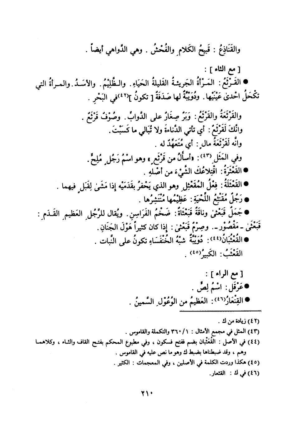 والقَنَاذِعُ قَبيحَ الكَلامِ والفُحْشُ . وهي الدَّواهي أيضاً . مع الثاء : القَرْثَعُ المَرْأةُ الجَريئةُ القَليلةُ الحَيَاءِ . والظَّلِيْمُ . والأسَدُ . والمرأةُ التي تكْحَلُ إحْدى عَيْنَيْها . ودُوَيْبَّةٌ لها صَدَفَةٌ تكونُ في البَحْرِ . والقَرْثَعَةُ والقَرْثَعُ وَبَرٌ صِغَارٌ على الدَّوابِّ . وصُوْفٌ قَرْثَعٌ . وأنَّكَ لَقَرْثَعٌ أي تأتي الدَّناءةَ ولا تُبَالي ما كَسَبْتَ . وأنَّه لَقَرْثَعَةُ مالٍ أي مُتَعَهِّدٌ له . وفي المَثَلِ : ' اسأَلُ من قَرْثَعٍ ' وهو اسْمُ رَجُلٍ مُلِحٍّ . القَعْثَرَةُ اقْتِلاعُكَ الشَّيْءَ من أصْلِه . القعْثَلَةُ فِعْلُ المُقَعْثِلِ وهو الذي يَحْفرُ بقَدَميْه إِذامَشَى لِقَبَلٍ فيهما . رَجْلٌ مُقَنْثِعُ اللِّحْيَةِ عَظِيْمُها مُنْتَشِرُها . جَمَلٌ قَبَعْثى وناقَةٌ قَبَعْثَاةٌ ضَخْمُ الفَرَاسِنِ . ويُقال للرَّجُلِ العَظيمِ القَدَمِ قَبَعْثى - مَقْصُوْر وصِرْمٌ قَبَعْثى إِذا كان كثيراً هَوْلَ الجَنَانِ . القُعْثُبَانُ دُوَيْبَّةٌ شَبْهُ الخُنْفَسَاءِ تكونُ على النَّبات . القَعْثَبُ الكَبيرُ . مع الراء : عَرْقَل اسْمُ لِصٍّ . القِنْعَارُ العَظِيمُ من الوُعُوْلِ السَّمينُ .