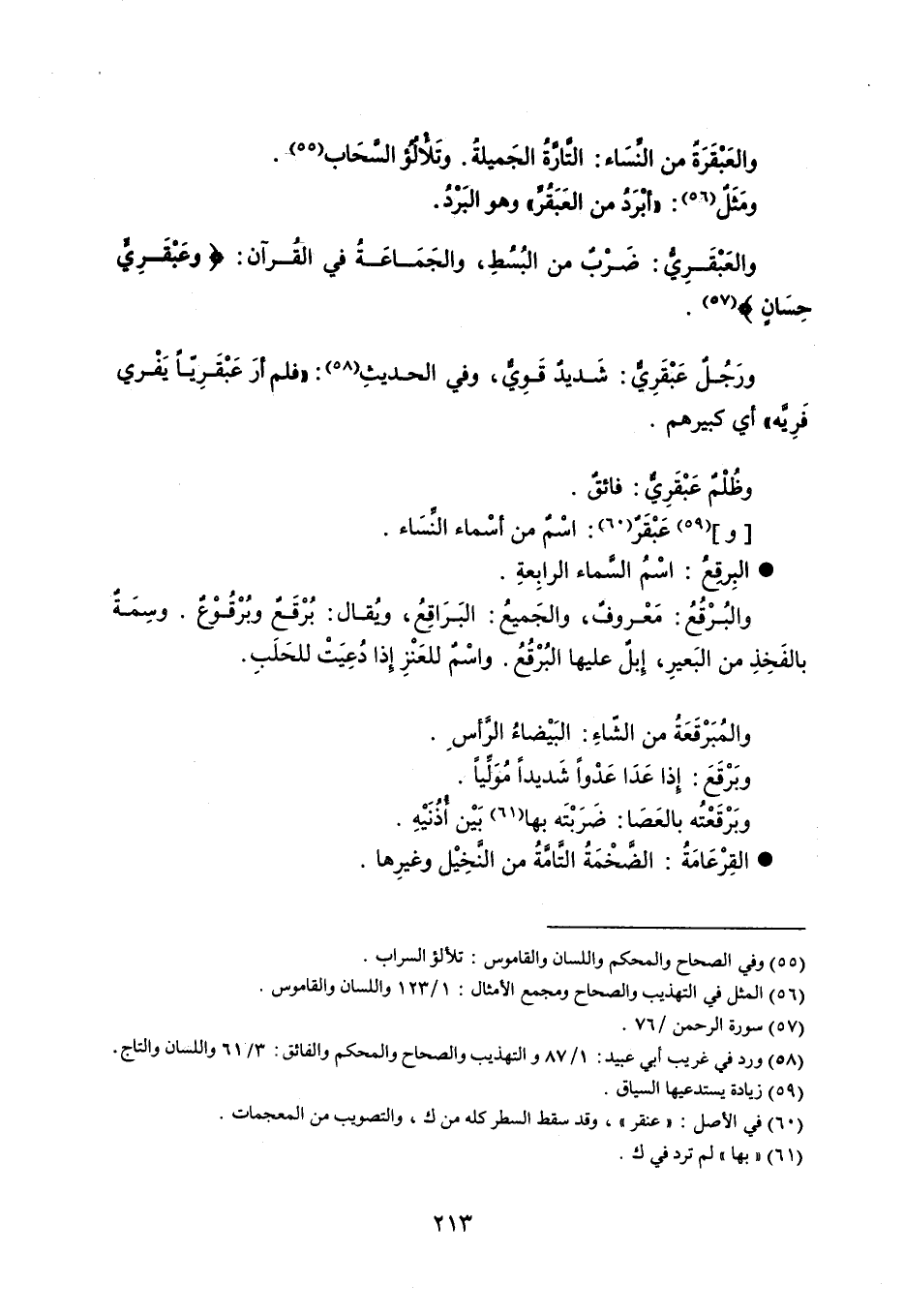 والعَبْقَرَةُ من النِّسَاء : التَّارَّةُ الجَميلةُ ، وتَلاْلُؤ السَّحَاب . ومَثَلٌ : ' أبْرَدُ من العَبَقُرِّ ' وهو البَرْدُ . والعَبْقَرِيُّ : ضَرْبٌ من البُسُطِ ، والجَمَاعَةُ في القُرآن : ' وعَبْقَرِيِّ حِسَانٍ ' . ورَجُلٌ عَبْقَرِيٌّ : شَديدٌ قَوِيٌّ ، وفي الحديثِ : ' فلم أرَ عَبْقَرِيّاً يَفْري فَرِيَّه ' أي كبيرهم . وظُلْمٌ عَبْقَرِيٌّ : فائقٌ . وعَبْقَرٌ : اسْمٌ من أسْماء النِّسَاء . ؟ البِرقِعُ : اسْمُ السَّماء الرابِعِة . والبُرْقُعُ : مَعْروفٌ ، والجَميعُ : البَرَاقِعُ ، ويُقال : بُرْقَعٌ وبُرْقُوْعٌ . وسِمَةٌ بالفَخِذِ من البَعيرِ ، إِبلٌ عليها البُرْقُعُ . واسْمٌ للعَنْزِ إِذا دُعِيَتْ للحَلَبِ . والمُبَرْقَعَةُ من الشّاءِ : البَيْضاءُ الرَّأسِ . وبَرْقَعَ : إِذا عَدَا عَدْواً شَديداً مُوَلِّياً . وبَرْقَعْتُه بالعَصَا : ضَرَبْتَه بها بَيْن أُذُنَيْهِ . ؟ القِرْعَامَةُ الضَّخْمَةُ التَّامَّةُ من النَّخِيْل وغيرِها .