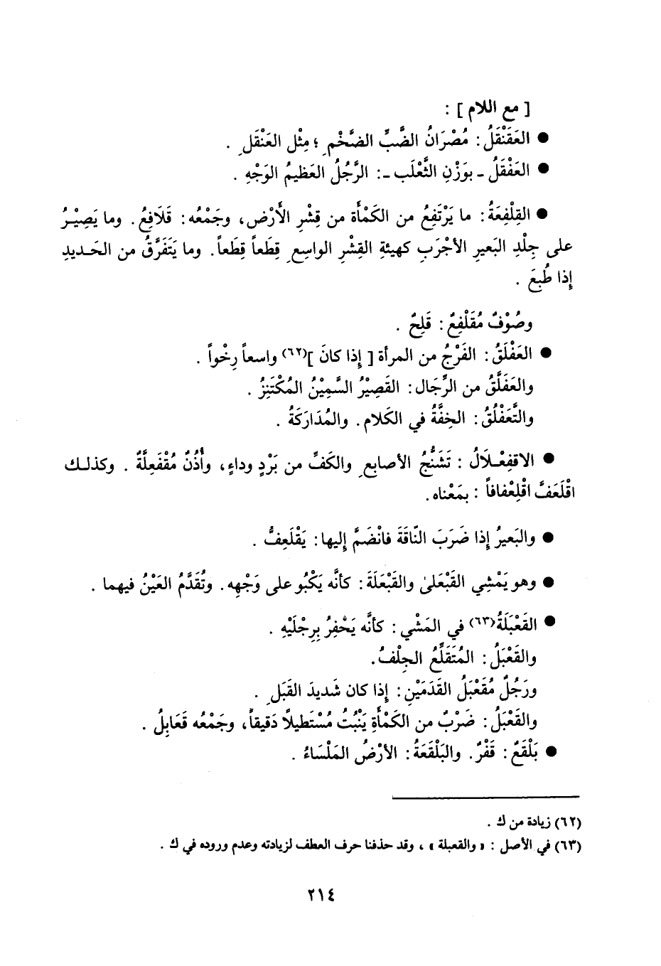 مع اللام : العَقَنْقَلُ مُصْرَانُ الضَّبِّ الضَّخْمِ ؛ مِثْل العَنْقَلِ . العَفْقَلُ - بوَزْنِ الثَّعْلَب - الرَّجُلُ العَظيمُ الوَجْهِ . العِلْفَعَةُ ما يَرْتَفِعُ من الكَمْأَة من قِشْرِ الأَرْض ، وجَمْعُه قَلاَفِعُ . وما يَصِيْرُ على جِلْدِ البَعيرِ الأجْرَبِ كهيئةِ القِشْرِ الواسِعِ قِطَعاً . وما يَتَفَرَّقُ من الحَديدِ إِذا طُبعَ . وصُوْفٌ مُقَلْفِعٌ قَلِحٌ . العَفْلقُ الفَرْجُ من المرأة إذا كانَ واسعاً رِخْواً . والعَفَلَّقُ من الرِّجَال القَصِيْرُ السَّمِيْنُ المُكْتَنِزُ . والتَّعَفْلُقُ الخَفَّةُ في الكَلام . والمُدَارَكَةُ . الاقفِعْلاَلُ تَشَنُّجُ الأصابعِ والكَفِّ من بَرْدٍ وداءٍ ، وأُذُنٌ مُقْفَعِلَّةٌ ، وكذلك اقْلَعَفَّ اقْلِعْفافاً بمَعْناه . والبَعيرُ إِذا ضَرَبَ النّاقَةَ فانْضَمَّ إِليها يَقْلَعِفُّ . وهو يَمْشِي القَبْعَلى والقَبْعَلَةَ كأنَّه يَكْبُو على وَجْهِه . وتُقَدَّمُ العَيْنُ فيهما . القَعْبَلَةُ في المَشْي كأنَّه يَحْفِرُ بِرِجْلَيْهِ . والقَعْبَلُ المُتَقَلِّعُ الجِلْفُ . ورَجُلٌ مُقَعْبَلُ القَدَمَيْنِ إِذا كان شَديدَ القَبَلِ . والقَعْبَلُ ضَرْبٌ من الكَمْأَةِ يَنْبُتُ مَسْتَطيلاً دَقيقاً ، وجَمْعُه قَعَابِلُ . بَلْقَعٌ قَفْرٌ . والبَلْقَعَةُ الأرْضُ المَلْسَاءُ .