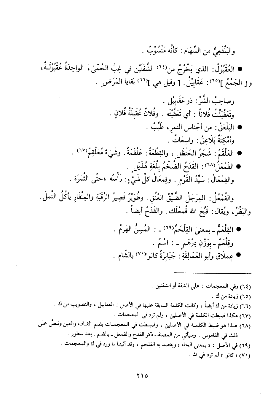 والبَلْقَعِيُّ من السِّهَام كأنَّه مَنْسُوْبٌ . العُقْبُوْلُ الذي يَخْرُجُ من الشَّفَتَيْن في غِبِّ الحُمّى ، والواحِدَةُ عُقْبُوْلَةٌ والجَمْعُ عَقَابِيْلُ . وقيل هي بَقايا المَرَضِ . وصاحِب الشَّرِّ ذو عَقَابِيْل . وتَعَقْبَلْتُ فُلاناً أي تَعَقَّبْتَه . وفُلانٌ عُقَبِلَةٌ فُلانٍ . البَلْعَقُ من أجْناس التمرِ ، طَيِّبٌ . وأمْكِنَةٌ بَلاَعِقُ واسِعَاتٌ . العَلْقَمُ شَجَرُ الحَنْظَلِ ، والقِطْعَةُ عَلْقَمَةٌ . وشَيْءٌ مُعَلْقِمٌ . القَمْعَلُ القَدَحُ الضَّخْمُ بِلُغَةِ هُذَيْلٍ . والقِمْعَالُ سَيِّدُ القَوْمِ . وقِمعَالُ كلِّ شَيْءٍ رأْسُه ؛ حتّى الثَّمَرَة . والقُمْعُلُ المِرْجَلُ الضَّيِّقُ العُنُقِ . وطُوَيْرٌ قَصِيرُ الرَّقَبَةِ والمِنْقَارِ يأكُلُ النَّملَ . والبَظْرُ ، ويُقال قَبَّحَ الله قُمعُلَك . والقَدَحُ أيضاً . ؟ القِلْعَمُّ - بمعنى القِلْحَمِّ - المُسِنُّ الهَرمُ . وقِلْعَمٌ - بِوَزْنِ دِرْهَمٍ - اسْمٌ . عِملاَق وأبو العَمَالِقَةِ جَبَابِرَةٌ كانوا بالشّام .