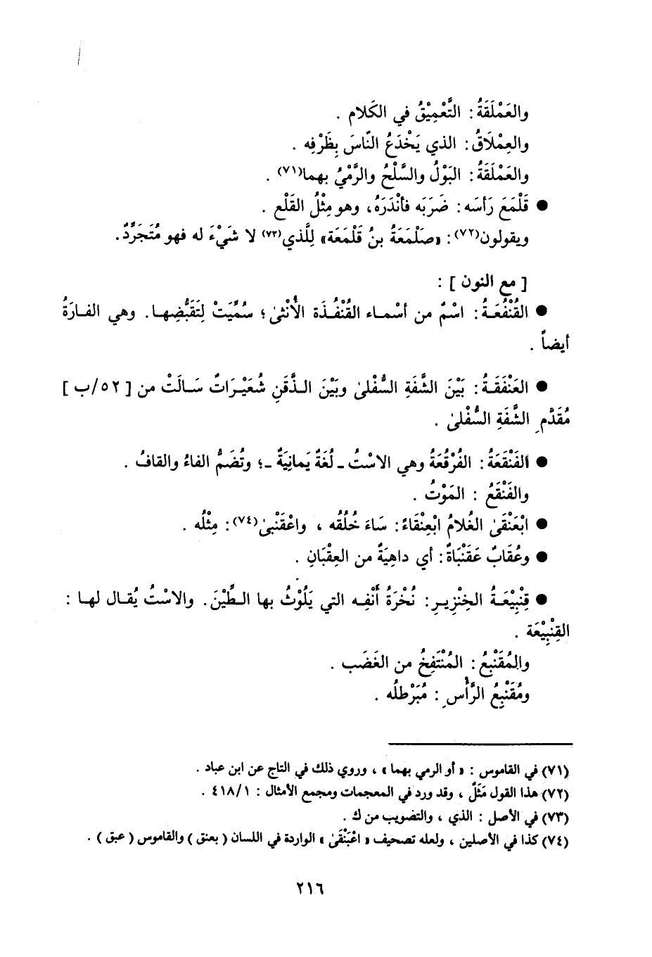 والعَمْلَقَةُ التَّعْمِيْقُ في الكَلام . والعِمْلاَقُ الذي يَخْدَعُ النّاسَ بِظَرْفَه . والعَمْلَقَةُ البَوْلُ والسَّلْحُ والرَّمْيُ بها . قَلْمَعَ رَأسَه ضَرَبَه فأنْدَرَهُ ، وهو مِثْلُ القَلْع . ويقولون ' صَلْمَعَةُ بنُ قَلْمَعَة ' لِلَّذي لا شَيْءَ له فهو مُتَجَرِّدٌ . مع النون القُنْفُعَةُ اسْمٌ من أسْماء القُنْفُذَة الأُنْثى ؛ سُمِّيَتْ لِتَقَبُّضِها . وهي الفارَةُ أيضاً . العَنْفَقَةُ بَيْنَ الشَّفَةِ السُّفْلى وبَيْنَ الذَّقَنِ شُعَيْرَاتٌ سَالَتْ من مُقَدَّمِ الشَّفَةِ السُّفْلى . الفَنْقَعَةُ الفُرْقُعَةُ هي الاسْتُ - لُغَةٌ يَمانِيَةٌ - ؛ وتُضَمُّ الفاءُ والقافُ . والفَنْقَعُ المَوْتُ . أبْعَنْقى الغُلامُ أبْعِنْقَاءً : سَاءَ خُلُقُه ، واعْقَنْبى : مِثْلهُ . وعُقَابٌ عَقَنْبَاةٌ أي داهِيَةٌ من العِقْبَانِ . قِنْبِيْعَةُ الخِنْزِيرِ نُخْرَةُ أَنْفِه التي يَلُوثُ بها الطِّيْنَ . والأسْتُ يُقال لها القِنْبِيْعَة . والمُقَنْبُع المُنْتَفِخُ من الغَضَب . ومُقَنْبِعُ الرَّأْسِ مُبَرْطلُه .