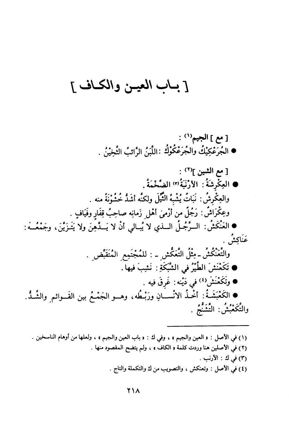 مع الجيم : الجُرَعْكِيْكُ والجُرَعْكُوْكُ اللَّبَنُ الرَّائبُ الثَّخِيْنُ . مع الشين : العِكْرِشَةُالأرْنَبَةُ الضَّخْمَةُ . والعِكْرِشُ نَبَاتٌ يُشْبِهُ الثَّيِّلَ ولكنَّه أشَدُّ خُشُوْنَةً منه . وعِكْرَاشٌ رَجُلٌ من أرْمى أهْلِ زَمانِه صاحِبُ قِفَارٍ وفَيَافٍ . العَنْكَشُ الرَّجُلُ الذي لا يُبالي أن لا يَدَّهِنَ ولا يَتَزَيَّنَ ، وحَمْعُهْ عَنَاكِشُ . والتَّعْنَكَشُ : - مِثْلُ التَّعَكُّشِ - : للمُجْتَمِعِ المُتَقَبِّضِ . تَكَعْنَشَ الطًّيْرُ في الشَّبَكِة نَشِبَ فيها . وتَكَعْنَشَ في دَيْنه غَرِقَ فيه . الكَعْبَشَةُ أخْذُ الأنْسانِ ورَبْطَه ، وهو الجَمْعُ بين القَوائمِ والشَّدُّ والتَّكَعْبُشُ التَّشَنُّجُ .
