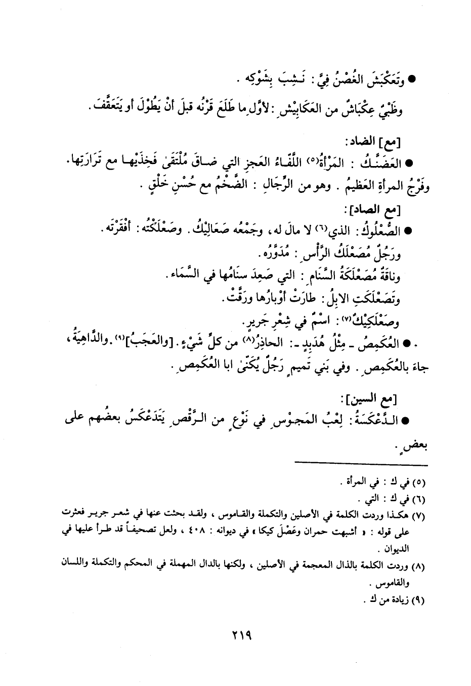 وتَعَكْبَشَ الغُصْنُ فِيَّ نَشِبَ بِشَوْكَه . وظَبْيٌ عِكْبَاشٌ من العَكَابِيْشِ لأوَّلِ ما طَلَعَ قَرْنُه قبلَ أنْ يَطُوْلَ أو يَتَعَقَّفَ . مع الضاد : العَضَنَّكُ المَرْأةُ اللَّفّاءُ العَجزِ التي ضاقَ مُلْتَقَى فَخِذَيْها مع تَرَارَتِها . وفَرْجُ المرأةِ والعَظيمُ . وهو من الرِّجَالِ الضَّخْمُ مع حُسْنِ خَلْقٍ . مع الصاد : الصُّعْلُوكُ الذي لا مالَ له ، وجَمْعُه صَعَالِيْكُ . وصَعْلَكْتُه أفْقَرْتَه . ورَجُلٌ مُصَعْلَكُ الرَّأْسِ مُدَوَّرُه . وناقَةٌ مُصَعْلَكَةُ السَّنَامِ التي صَعِدَ سنَامُها في السَّمَاء . وتَصَعْلَكَت الإبِلَ طارَتْ أوْبارُها ورَقَّتْ . وصَعْلَكِيْكٌ اسْمٌ في شِعْرِ جَريرٍ . العُكَمِصُ - مِثْلُ هُدَبِدٍ - الحاذِرُ من كلِّ شَيْءٍ . والعَجَبُ . والدَّاهِيَةُ ، جاءَ بالعُكَمِصِ . وفي بَني تَميمٍ رَجُلٌ يُكَنّى أبا العُكَمِصِ . مع السين : الدَّعْكَسَةُ لِعُبَ المَجوْسِ في نَوْعٍ من الرَّقْصِ يَتَدَعْكَسُ بعضُهم على بعضٍ .