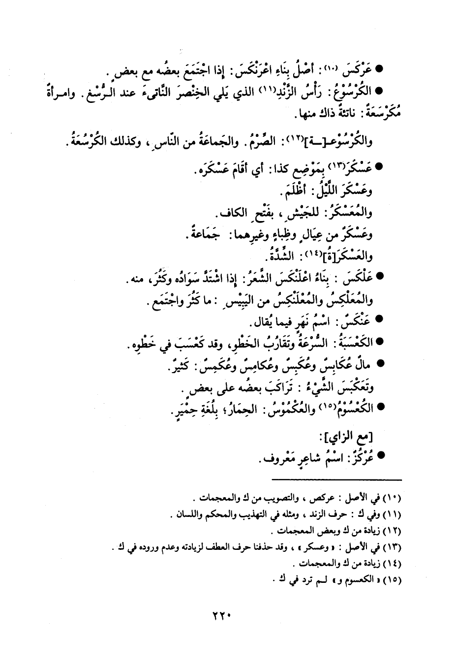 عَرْكَسَ أصْلُ بِنَاءِ اعْرَنْكَسَ إِذا اجْتَمَعَ بعضُه مع بعضٍ . الكُرْسُوْعُ رَأْسُ الزَّنْدِ الذي يَلي الخِنْصرَ النَّاتئَ عند الرُّسْغ . وامرأةٌ مُكَرْسَعَةٌ ناتئةٌ ذاك منها . والكُرْسُوْعة الصِّرْمُ . والجَماعَةُ من النّاسِ ، وكذلك الكُرْسُعُةُ . عَسْكَرَ بِمَوْضِع كذا أي أقَامَ عَسْكَرَه . وعَسْكَرَ اللَّيْلُ أظْلَمَ . والمُعَسْكَرُ للجَيْشِ ، بفَتْحِ الكاف . وعَسْكَرٌ من عِيَالٍ وظِباءٍ وغيرِهما جَمَاعةٌ . والعَسْكَرَةُ الشِّدَّةُ . عَلْكَسَ بِنَاءُ اعْلَنْكَسَ الشَّعَرُ إِذا اشْتَدَّ سَوَادُه وكَثْرَ ، منه . والمُعَلْكِسُ والمُعْلَنْكِسُ مِنَ اليَبِيْسِ ما كَثُرَ واجْتَمَع . عَنْكَسٌ اسْمُ نَهَرٍ فيما يُقال . الكَعْسَبَة السُّرْعَةُ وتَقَارُبُ الخَطْوِ ، وقد كَعْسَبَ في خَطْوِه . مالٌ عُكَابِسٌ وعُكَبِسٌ وعُكامِسٌ وعُكَمِسٌ كَثيرٌ . وتَعَكْبَسَ الشَّيْءُ تَرَاكَبَ بعضُه على بعضٍ . الكُعْسُوْمُ والعُكْمُوْسُ الحَمارُ ؛ بِلُغَةِ حِمْيَرٍ . مع الزاي : عُرْكُرٌ اسْمُ شاعِرٍ مَعْروف .