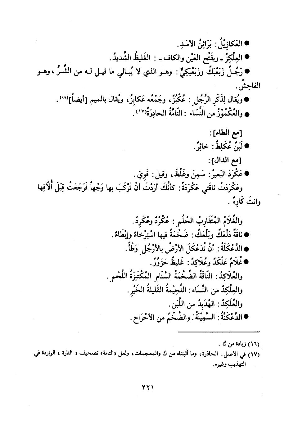 العَكازِيْلُ بَرَاثِنُ الأسَدِ . العِلْكِزُ - وبفَتْح العَيْن والكاف - الغَليظُ الشَّديدُ . رَجُلٌ زَبَعْبَكٌ وزَبَعْبَكِيٌّ وهو الذي لا يُبالي ما قيل له من الشَّرِّ ، وهو الفاحِشُ . ويُقال لِذَكَرِ الرَّجُلِ عُكْبُزٌ ، وجَمْعُه عَكابِزُ ، ويُقال بالميم أيضاً . والعُكْمُوْزُ من النَّسَاء التّامَّةُ الحادِرَةُ . مع الطاء : لَبَنٌ عُكَلِطٌ خاثِرٌ . مع الدال : عَكْرَدَ البَعيرُ : سَمِنَ وغَلُظَ ، وقيل : قَوِيَ . وعَكْرَدَتْ ناقَتي عُكْرَدَةً : كأنَّكَ أرَدْتَ أنْ تَرْكَبَ بها وَجْهاً فَرَجَعَتْ قِبَلَ أُلاّفِها وأنتَ كَارِهٌ . والغُلاَمُ المُتَقَارِبُ الحُلُمِ : عُكْرُدٌ وعُكَرِدٌ . ناقَةٌ دَلْعَكٌ وبَلْعَكٌ ضَخْمَةٌ فيها اسْتِرْخاءٌ وإبْطَاءٌ . الدَّعْكَلَةُ أنْ تُدَعْكَلَ الأرْضَ بالأرْجُلِ وَطْأً . غُلاَمٌ عَلْكَدٌ وعُلاَكِدٌ غَليظٌ حَزَوَّرٌ . والعُلاَكِدُ النّاقَةُ الضَّخْمَةُ السَّنَامِ المُكْتَنِزَةُ اللَّحْمِ . والعُلْكِدُ من النِّسَاء : اللَّحِيْمةُ القَليلة الخَيْرِ . والعُلَكِدُ : الهُدَبِدُ من اللَّبَن . الدِّعْكَنَّةُ السَّمِيْنَةُ والضَّخْمُ من الأحْرَاح .