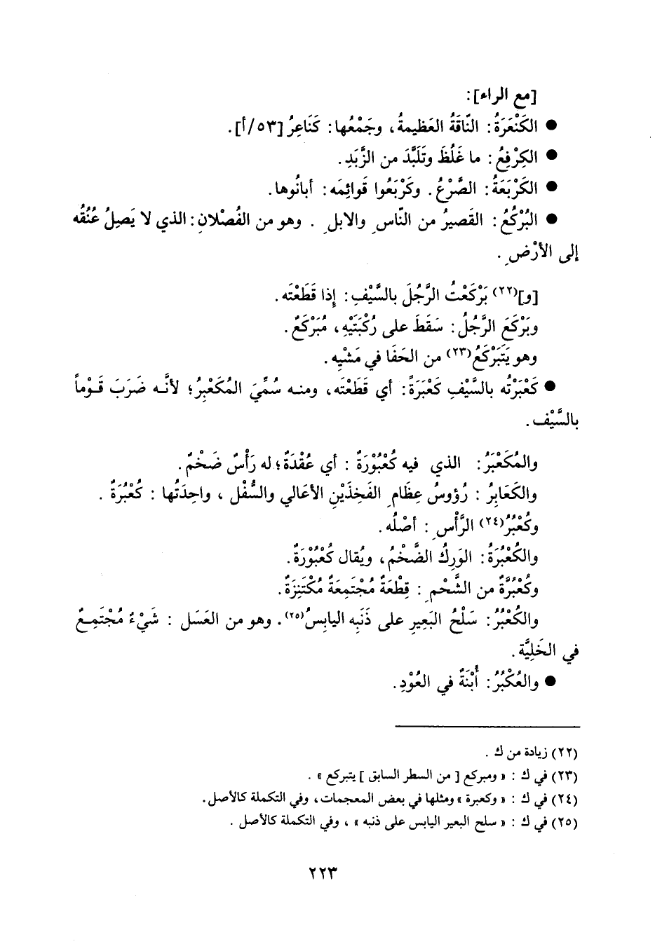 مع الراء : الكَنْعَرةُ النّاقَةُ العَظيمةُ ، وجَمْعُها كَنَاعِرُ . الكِرْفِعُ ما غَلْظَ وتَلَبَّدَ من الزَّبَدِ . الكَرْبَعَةُ الصَّرْع . وكَرْبَعُوا قَوائِمَه أبانُوها . البُرْكُعُ القَصيرُ من النّاسِ والإبلِ . وهو من الفُصْلانِ الذي لا يَصِلُ عُنُقُه إلى الأرْضِ . وبَرْكَعْتُ الرَّجُلَ بالسَّيْفِ : إِذا قَطَعْتَه . وبَرْكَعَ الرَّجُلُ : سَقَطَ على رُكْبَتَيْهِ ، مُبَرْكَعٌ . وهو يَتَبَرْكَعُ : من الحَفَا في مَشْيِه . كَعْبَرْتُه بالسَّيْفِ كَعْبَرَةً أي قَطَعْتَه ، ومنه سُمِّيَ المُكَعُبِرُ ، لأنَّه ضَرَبَ قَوْماً بالسِّيْف . والمُكَعْبَرُ الذي فيه كُعْبُوْرَةٌ أي عُقْدَةٌ ؛ له رَأْسٌ ضَخْمٌ . والكَعَابِرُ رُؤوسُ عِظَامِ الفَخِذَيْنِ الأعَالي والسُّفْل ، واحِدَتُها كُعْبُرَةٌ . وكُعْبُرُ الرَّأْسِ أصْلُه . والكُعْبُرَةُ الوَرِكُ الضَّخْمُ ، ويُقال كُعْبُوْرَةٌ . وكُعْبُرَّةٌ من الشَّحْمِ قِطْعَةٌ مُجْتَمِعَةٌ مُكْتَنِزَةٌ . والكُعْبُرُ سَلْحُ البَعِيرِ على ذَنَبِه اليابِسُ . وهو من العَسَل شَيْءٌ مُجْتَمِعٌ في الخَلِيَّة . والعُكْبُرُ أُبْنَةٌ في العُوْدِ .