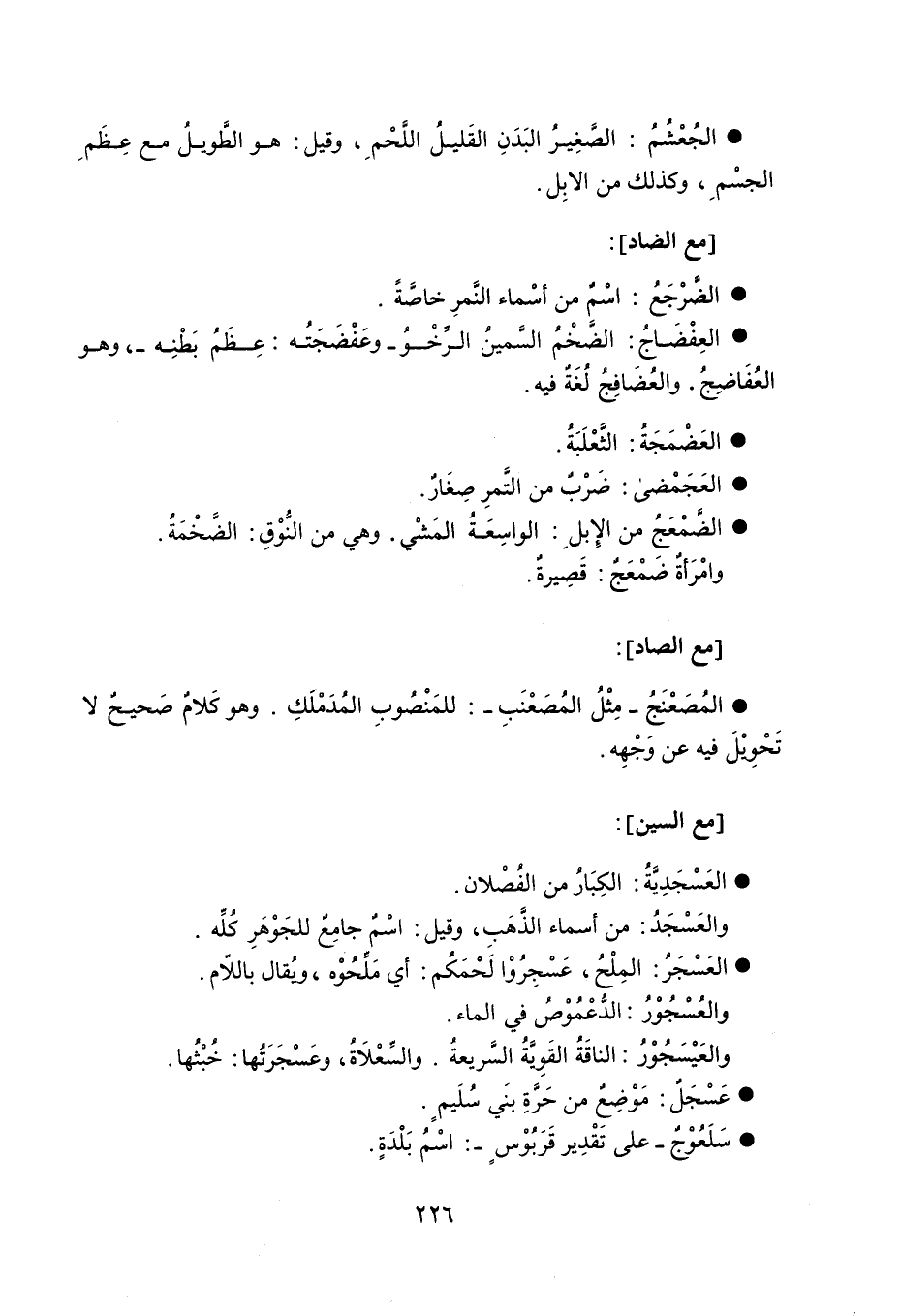 الجُعْشُمُ الصَّغِيرُ البَدَنِ القَليلُ اللَّحْمِ ، وقيل هو الطَّويلُ مع عِظَمِ الجسْمِ ، وكذلك من الإبِل . مع الضاد : الضَّرْجَعُ اسْمٌ من أسْماء النَّمرِ خاصَّةً . العِفْضَاجُ الضَّخْمُ السَّمينُ الرِّخْوُ - وعَفْضَجَتُه عِظَمُ بَطْنِه - ، وهو العُفَاضِجُ . والعُضَافِجُ لُغَةٌ فيه . العَضْمَجَةُ الثَّعْلَبَةُ . العَجَمْضى ضَرْبٌ من التَّمرِ صِغَارٌ . الضَّمْعَجُ من الإِبِلِ الواسِعَةُ المَشْي ، وهي من النُّوْقِ الضَّخْمَةُ . وامْرَأةٌ ضَمْعَجٌ قَصِيرةٌ . مع الصاد : المُصَعْنَجُ - مِثْلُ المُصَعْنَبِ - : للمَنْصُوبِ المُدَمْلَكِ . وهو كَلامٌ صَحيحُ لا تَحْوِيْلَ فيه عن وَجْهِه . مع السين : العَسْجَدِيَّةُ الكِبَارُ من الفُصْلان . والعَسْجَدُ من أسماء الذَّهَبِ ، وقيل اسْمٌ جامِعٌ للجَوْهَرِ كُلِّه . العَسْجَرُ المِلْحُ ، عَسْجِرُوْا لَحْمَكُم أي مَلِّحُوه ، ويُقال باللاّم . والعُسْجُوْرُ الدُّعْمُوْصُ في الماء . والعَيْسَجُوْرُ الناقَةُ القَوِيَّةُ السَّريعةُ . والسَّعْلاَةُ ، وعَسْجَرَتُها خُبْثُها . عَسْجَلٌ مَوْضِعٌ من حَرَّةِ بنَي سُلَيمٍ . سَلَعُوْجٌ - على تَقْدِير قَرَبُوْسٍ - اسْمُ بَلْدَةٍ .