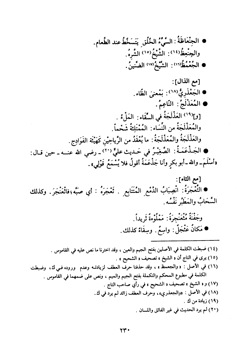 الجِنْعَاظَةُ السَّيِّءُ الخُلُقِ يَتَسَخَّطُ عند الطَّعام . والجِنْعِظُ الشَّيْخُ الشَّرِهُ . الجُعْمُظُ الشَّيْخُ الضَّنينُ . مع الذال : الجَعْذَرِيُّ بَمْعنى الظّاء . المُعَذْلَجُ النّاعِمُ . و العَذْلَجَةُ في السِّقَاء المَلْءُ . والمُعَذْلَجَةُ من النِّسَاء المُمْتَلِئةُ شَحْماً . والعَذْلَجَةُ والمُعَذْلَجَةُ ما يُعْقَدُ من الرَّياحِيْنِ كَهَيْئَة الفَوَادِج . الجَذْعَمَةُ الصَّغِيْرُ في حَديث عليٍّ - رضي الله عنه - حين قال ' أسْلَمَ - والله - أبو بكرٍ وأنا جَذْعَمَةٌ أقُولُ فلا يُسْمَعُ قَوْلِي ' . مع الثاء : الثَّعْجَرَةُ : انْصِبَابُ الدَّمْعِ المُتَتَابِعِ . ثَعْجَرَهُ : أي صَبَّه ؛ فاثْعَنْجَرَ . وكذلك السَّحَابُ والمَطَبُر نَفْسَه . وجَفْنَةٌ مُثْعَنْجِرَةٌ : مَمْلُوْءةٌ ثَريداً . مَكانٌ عَثْجَلٌ واسِعٌ . وسِقَاءٌ كذلك .