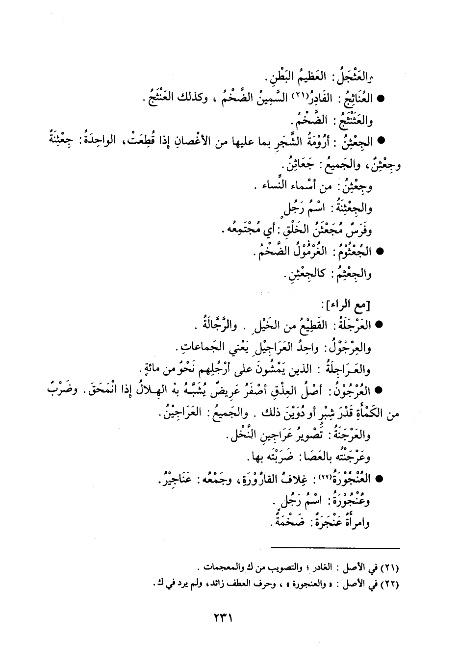 والعَثْجَلُ العَظيمُ البَطْنِ . العُنَاثِجُ الفَادِرُ السَّمِينُ الضَّخْمُ ، وكذلك العَنْثَجُ . والعَثَنْثَجُ الضَّخْمُ . الجِعْثِنُ أرُوْمَةُ الشَّجَرِ بما عليها من الأغْصانِ إِذا قُطِعَتْ ، الواحِدَةُ جِعْثِنَةٌ . وجِعْثِنٌ ، والجَميعُ جَعَاثِنُ . وجَعْثِنُ من أسْماء النِّساء . والجِعْثِنَةُ اسْمُ رَجُلٍ . وفَرَسٌ مُجَعْثَنُ الخَلْقِ أي مُجْتَمِعُه . الجُعْثُوْمُ الغُرْمُوْلُ الضَّخْمُ . والجِعْثِمُ كالجِعْثِنِ . مع الراء : العَرْجَلَةُ القَطِيْعُ من الخَيْلِ . والرَّجِّالَةُ . والعَرْجَوْلُ واحِدُ العَرَاجِيْلِ يَعْني الجَماعاتِ . والعَرَاجِلَةُ الذين يَمْشُونَ على أرْجُلِهم نَحْوٌ من مائةٍ . العُرْجُوْنُ أصْلُ العِذْقِ أصْفَرُ عَرِيضٌ يُشَبَّهُ به الهِلالُ إِذا انْمَحَق . وضَرْبٌ من الكَمْأَةِ قَدْرَ شِبْرٍ أو َدُوَيْنَ ذلك . والجَميعُ العَرَاجِيْنُ . والعَرْجَنَةُ تَصْويرُ عَرَاجِينِ النَّخْل . وعَرْجَنْتَه بالعَصَا ضَرَبْتَه بها . العُنْجُوْرَةُ غِلافُ القارُوْرَةِ ، وجَمْعُه عَنَاجِيْرُ . وعُنْجُوْرَةُ اسْمُ رَجُلٍ . وامرأَةٌ عُنْجَرَةٌ ضَخْمَةٌ .