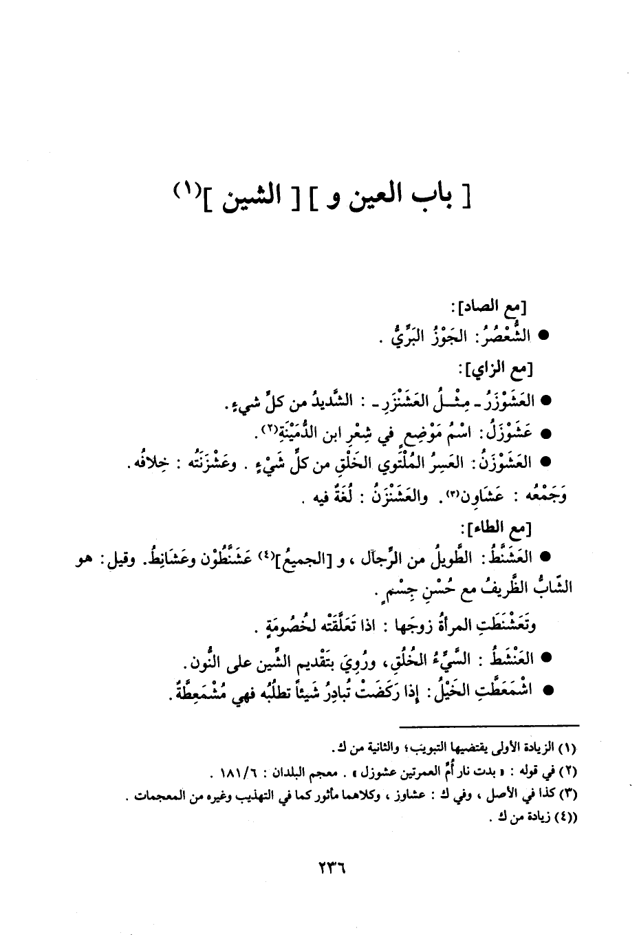 باب العين والشين مع الصاد : الشُّعْصُرُ الجَوْزُ البَرِّيُّ . مع الزاي : العَشَوْزَرُ - مِثْلُ العَشَنْزَرِ - الشَّديدُ من كلِّ شيءٍ . عَشَوْزَلُ اسْمُ مَوْضِعٍ في شِعْرِ ابن الدُّمَيْنَةِ . العَشَوْزَنُ العَسِرُ المُلْتَوي الخَلْقِ من كلِّ شَيْءٍ . وعَشْزَنَتُه خِلافُه . وجَمْعُه عَشَاوِن . والعَشَنْزَنُ لُغَةٌ فيه . مع الطاء : العَشَنَّطُ الطَّويلُ من الرّجال ، والجميعُ عَشَنَّطُوْن وعَشَانِطُ . وقيل هو الشّابُّ الظَّريفُ مع حُسْنِ جِسْمٍ . وتَعَشْنَطَتِ المرأةُ زوجَها إذا تَعَلَّقَتْه لخُصُومَةٍ . العَنْشَطُ السَّيِّءُ الخُلُقِ ، ورُوِيَ بتَقْديم الشِّين على النُّون . اشْمَعَطَّتِ الخَيْلُ إِذا رَكَضَتْ تُبادِرُ شَيئاً تطلُبُه فهي مُشْمَعِطَّةٌ .