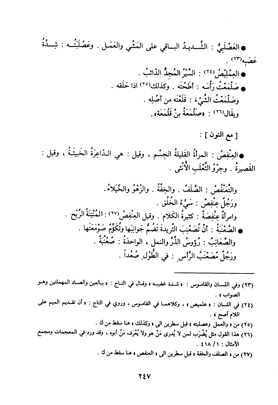 العَصْلَبِيُّ الشَّديدُ الباقي على المَشْي والعَمَل . وعَصْلَبَتُه شِدَّةُ عَصَبِه . العَمْلِيْصُ السَّيْرُ المُجِدُ الدّائبُ . صَلْمَعْتُ رَأْسَه أطَحْتَه . وكذلك إذا حَلَقه . وصَلْمَعْتُ الشَّيْءَ قَلَعْتُه من أصْلِه . ويُقال ' صَلْمَعَةُ بنُ قَلْمَعَة ' مع النون : العَنْفِصُ المرأةُ القليلةُ الجِسْم ، وقيل هي الدّاعِرَةُ الخَبيثَةُ ، وقيل القَصيرةُ . وجِرْوُ الثَّعْلَبِ الأُنْثى . والتَّعَنْفُصُ الصَّلَفُ . والخِفَّةُ . والزَّهْوُ والخُيَلاءُ . ورَجُلٌ عَنْفِصٌ سَيِّءُ الخُلُق . وامرأةٌ عَنْفَصَةٌ كثيرةُ الكَلام . وقيل العِنْفِصُ المُنْتِنَةُ الرِّيْح . الصَّعْنَبَةُ أنْ تُصَعْنِبَ الثَّريدَةَ تَضُمُّ جَوانِبَها وتُكَوِّمُ صَوْمَعَتَها . والصَّعَانِبُ رُؤوسُ الذَّرِّ والنمل ، الواحدَةُ صُعْنُبَةٌ . ورَجُلٌ مُصَعْنَبُ الرَّأسِ في الطُّوْلِ صُعُداً .