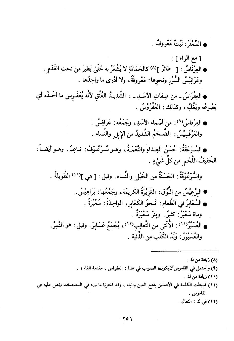 السَّعْتَرُ نَبْتٌ مَعْروفٌ . مع الراء : العَرْنَاسُ : طائرٌ كالحَمَامَةِ لا يُشْعَرُ به حَتّى يَطيَر من تحتِ القَدَمِ . وعَرَانِيْسُ السُّرُرِ ونحوِها : مَعْروفَةٌ ، ولا أدْري ما واحِدُها . العِفْرَاسُ - من صَفاتِ الأسَدِ - الشَّديدُ العُنُقِ لأنَّه يُعَفْرِس ما أخَذَه أي يَصْرعُه ويَغْلبُه ، وكذلك العُفْرُوْسُ . العِرْفاسُ من أسْماء الأسَدِ ، وجَمْعُه عَرافِسُ . والعَرْفَسِيْسُ الضَّخمُ الشَّديدُ من الإِبِلِ والنَّساء . السَّرْعَفَةُ حُسْنُ الغِذاءِ والنَّعْمَةُ ، وهو سُرْعُوْفٌ ناعِمٌ . وهو أيضاً الخَفيفُ اللَّحْمِ من كلِّ شَيْءٍ . والسُّرْعُوْفَةُ الحَسَنَةُ من الخَيْلِ والنِّساء . وقيل هي الطَّويلةُ . البِرْعِيْسُ من النُّوْق الغَزِيْرَةُ الكَريمُة ، وجَمْعُها بَرَاعِيْسُ . السَّعَابِرُ في الطَّعام نَحوُ الكَعَابِرِ ، الواحِدَةُ سُعْبَرةٌ . وماءٌ سَعْبَرٌ كثيرٌ . وبِئرٌ سَعْبَرَةٌ . العُسْبُرُ الأُنْثى من الثَّعالِبِ ، يُجْمَعُ عَسَابِرَ . وقيل هو النَّمِرُ . والعُسْبُوْرُ وَلَدُ الكَلْبِ من الذِّئبة .