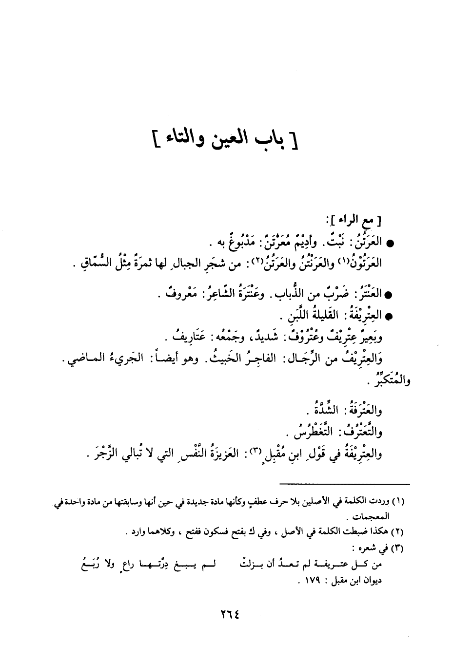 مع الراء : العَرَتُنُ نَبْتٌ . وأدِيْمٌ مُعَرْتَنٌ مَدْبُوغٌ به . العَرَتُوْنُ والعَرَنْتُنُ والعَرَتُنُ من شَجَرِ الجبالِ لها ثَمرَةٌ مِثْلُ السُّمّاقِ . العَنْتَرُ ضَرْبٌ من الذُّباب . وعَنْتَرَةُ الشّاعِر مَعْروفٌ . العِتْرِيْقَةُ القَليلةُ اللَّبَنِ . وبَعِيرٌ عَتْرِيْفٌ وعُتْرُوْفٌ شَديدٌ ، وجَمْعُه عَتَارِيفُ . وَالعِتْرِيْفُ من الرِّجَال الفاجِرُ الخَبيثُ ، وهو أيضاً الجَريءُ الماضي . والمُتَكبِّرُ . والعَتْرَفَةُ الشِّدَّةُ . والتَّعَتْرُفُ التَّغَطْرُسُ . والعِتْرِيْفَةُ في قَوْلِ ابنِ مُقْبِلٍ العَزيزَةُ النَّفْسِ التي لا تُبالي الزَّجْرَ . والعُتْرُفُ التَّغَطْرُسُ . والعِتْرِيْفَةُ في قَوْلِ ابنِ مُقْبِلٍ العَزيزَةُ النَّفْسِ التي لا تُبالي الزَّجْرَ .