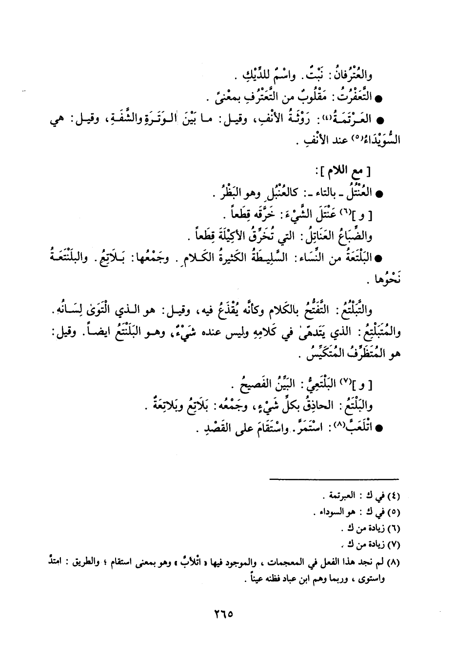والعُتْرُفانُ نَبْتٌ . واسْمٌ للدِّيْكِ . التَّعَفْرُتً من التَّعَفْرُفِ بمعنىً . العَرْتَمَةُ رَوْثَةُ الأنْفِ ، وقيل ما بَيْنَ الوَتَرَةِ والشّفَةِ ، وقيل هي السُّوَيْدَاءُ عند الأنْفِ . مع اللام : العُنْتُلُ - بالتاء - كالعُنْبُلِ وهو البَظْرُ . و عَنْتَلَ الشَّيْءَ خَرَّقَه قِطَعاً . والضِّبَاع والعَنَاتِلُ التي تُخَرِّقُ الأَكِيْلَةَ قِطَعَاً . البَلْتَعَةُ من النِّسَاء السَّلِيطَةُ الكَثيرةُ الكَلامِ . وجَمْعُها بَلاَتِعُ . والبَلنْتَعَةُ نَحْوُها . والتَّبَلْتُعُ : التَّفَتُّحُ بالكَلام وكأنَّه يُقْذَعُ فيه ، وقيل : هو الذي الْتَوَى لِسَانُه . والمُتَبَلْتِعُ : الذي يَتَدهّى في كَلامِهِ وليس عنده شَيْءٌ ، وهو البَلَنْتَعُ أيضاً . وقيل : هو المُتَظَرِّفُ المُتَكَيِّسُ . والبَلْتَعِيُّ : البَيِّنُ الفَصيحُ . والبَلْتَعُ : الحاذِقُ بكلِّ شَيْءٍ ، وجَمْعُه : بَلاَتِعُ وبَلاتِعَةٌ . اتْلَعَبَّ اسْتَمَرَّ . واسْتَقَامَ . واسْتَقَامَ على القَصْدِ .