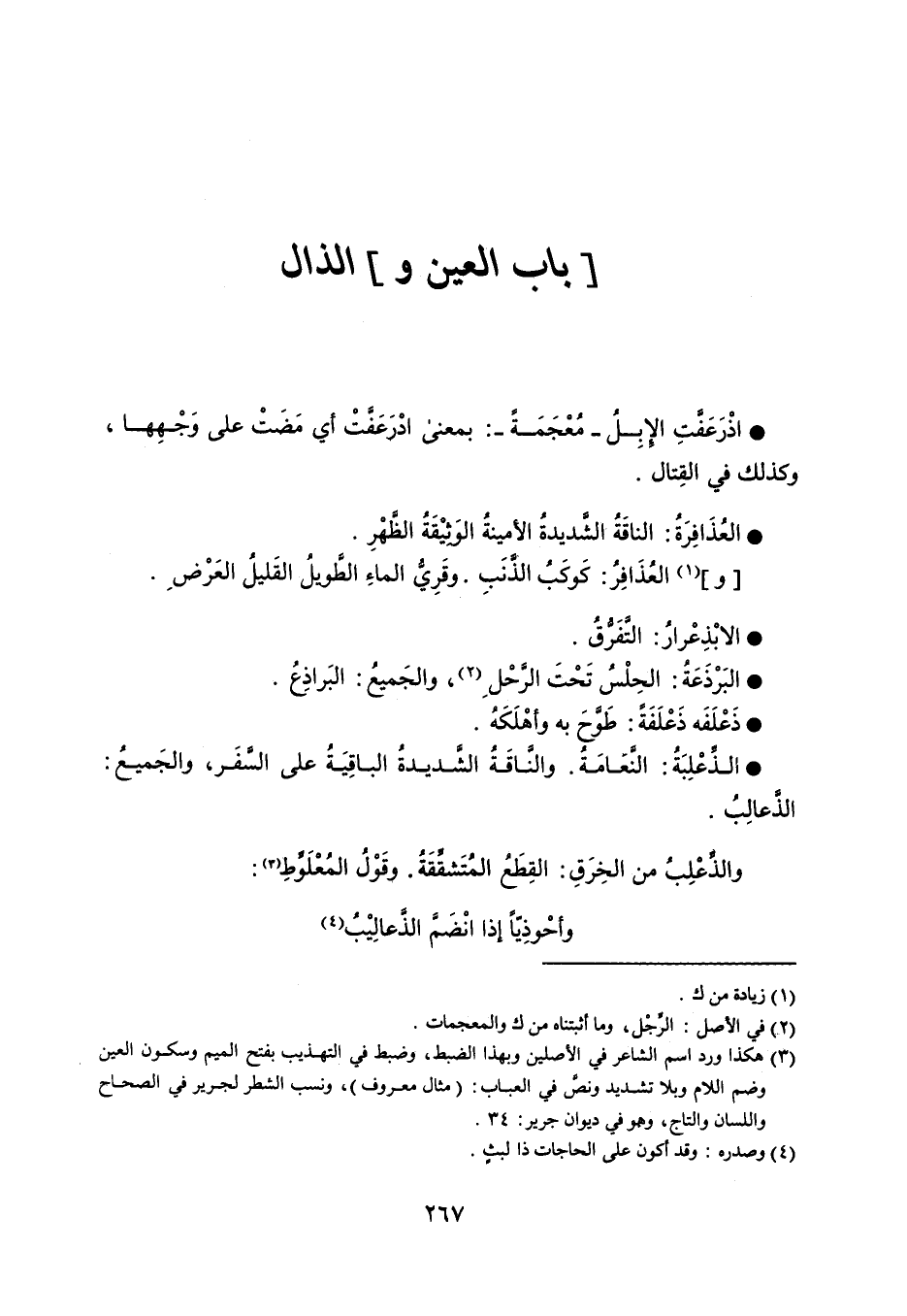 اذْرَعَفَّتِ الإِبِلُ - مُعْجَمَةً - بمعنى ادْرَعَفَّتْ أي مَضَتْ على وَجْهِها ، وكذلك في القِتال . العُذَافِرَةُ الناقَةُ الشَّديدةُ الأمينةُ الوَثِيْقَةُ الظَّهْرِ . العُذَافِرُ كَوكَبُ الذَّنَبِ . وقَرِيُّ الماءِ الطَّويلُ القَليلُ العَرْضِ . الابْذِعْرارُ التَّفَرُّقُ . البَرْذَعَةُ الحِلْسُ تَحْتَ الرَّحْلِ ، والجَميعُ البَراذِعُ . ذَعْلَفَه ذَعْلَفَةً طَوَّحَ به وأهْلَكَهُ . الذِّعْلِبَةُ النَّعَامَةُ ، والنَّاقَةُ الشَّديدةُ الباقِيَةُ على السَّفَر ، والجَميعُ الذَّعالِبُ . والذِّعْلِبُ من الخِرَقِ القِطَعُ المُتَشقِّقَةُ . وقَوْلُ المُعْلَوِّطِ . ' وأحْوذِّياً إذا انْضَمَّ الذَّعالِيْبُ ' .
