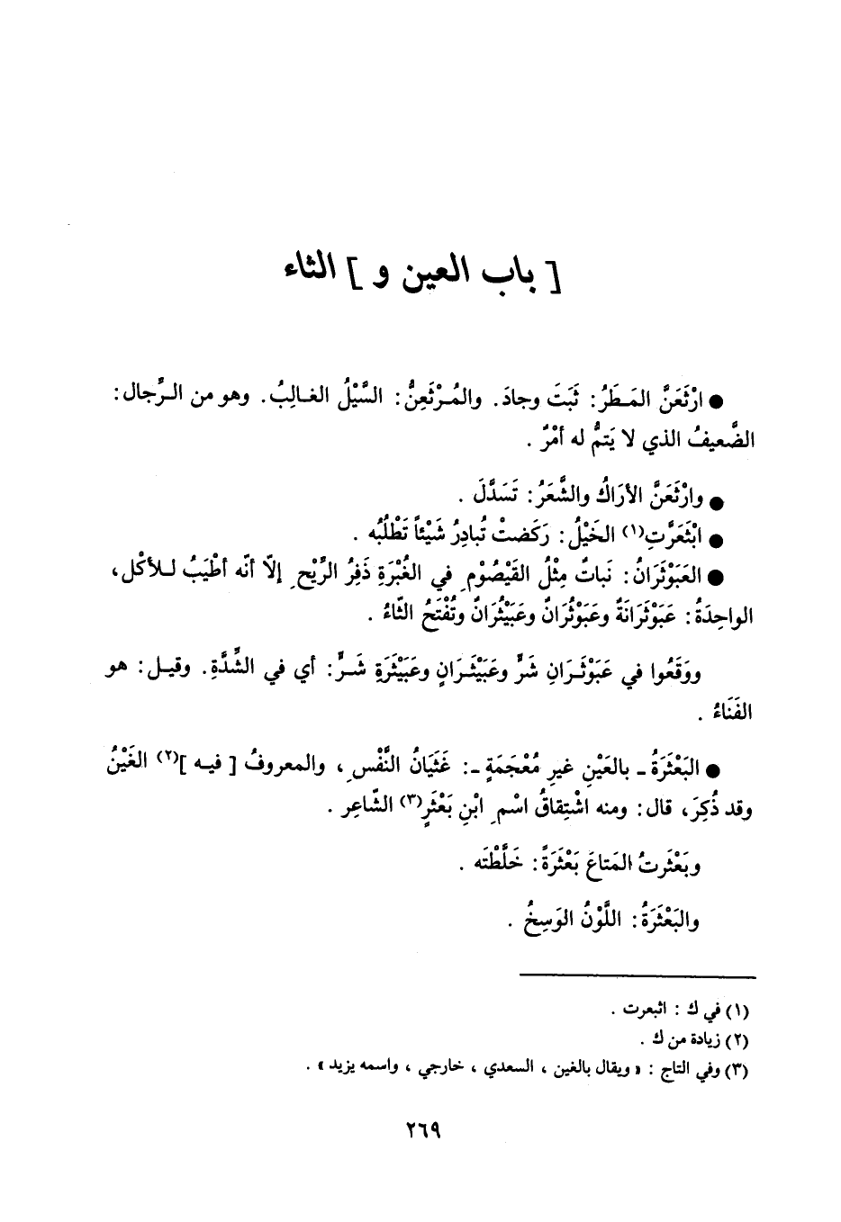 ارْثَعَنَّ المَطَرُ ثَبَتَ وجادَ . والمُرْثَعِنُّ السَّيْلُ الغالِبُ . وهو من الرِّجال الضَّعيفُ الذي لا يَتمُّ له أمْرٌ . وارْثَعَنَّ الأرَاكُ والشَّعَرُ تَسَدَّلَ . ابْثَعَرَّتِ الخَيْلُ رَكَضتْ تُبادِرُ شَيْئاً تَطْلُبُه . العَبَوْثَرَانُ نَباتٌ مِثْلُ القَيْصُوْمِ في الغُبْرَةِ ذَفِرَ الرِّيْحِ إلاّ انّه أطْيَبُ للأكْل ، الواحِدَةُ عَبَوْثَرَاتَةٌ وعَبَوْثُرَانٌ وعَبَيْثُرَانٌ وتُفْتَحُ الثّاءُ ووَقُعُوا في عَبَوْثَرَانِ شَرٍّ وعَبَيْثَرَانٍ وعَبَيْثَرَةِ شَرٍّ : أي في الشِّدَّةِ . وقيل : هو الفَنَاءُ . البَعْثَرَةُ - بالعَيْنِ غيرِ مُعْجَمَةٍ - غَثَيَانُ النَّفْسِ ، والمعروفُ فيه الغَيْنُ وقد ذُكِرَ ، قال ومنه اشْتِقاقُ اسْمِ ابْنِ بَعْثَرٍ الشَاعِر . وبَعْثَرتُ المَتاعَ بَعْثَرَةً خَلَّطَته . والبَعْثَرَةُ اللَّوْنُ الوَسِخُ .