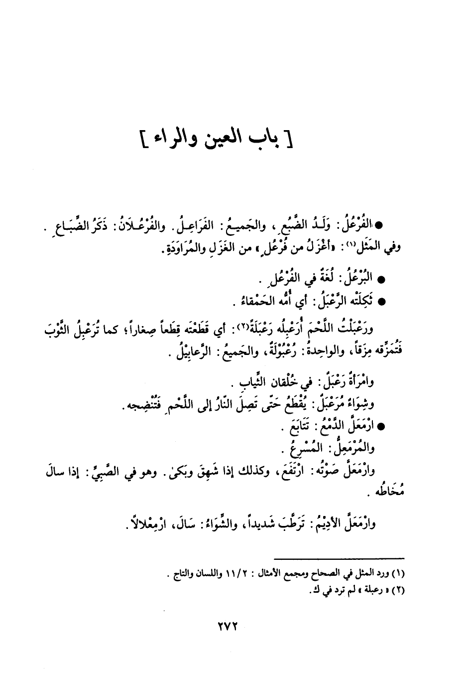 الفُرْعُلُ وَلَدُ الضَّبُعِ ، والجَميعُ الفَرَاعِلُ . والفُرْعُلاَنُ ذَكَرُ الضِّبَاعِ . وفي المَثَل ' أعْزَلُ من فُرْعُلٍ ' من الغَزَلِ والمُرَاوَدَةِ . البُرْعُلُ لُغَةٌ في الفُرْعُلِ . ثَكِلَتْه الرَّعْبَلُ أي أُمُّه الحَمْقاءُ . ورَعْبَلْتُ اللَّحْمَ أُرَعْبِلُه رَعْبَلُه أي قَطَعْتَه قِطَعاً صِغاراً ، كما تُرَعْبِلُ الثَّوْبَ فَتُمَزِّقه مِزَقاً ، والواحِدةُ رُعْبُوْلَةٌ ، والجَميعُ الرَّعابِيْلُ . وامْرَأةٌ رَعْبَلٌ في خُلْقان الثِّيابِ . وشِوَاءٌ مُرَعْبَلٌ يُقْطَعُ حَتّى تَصِلَ النّارُ إلى اللَّحْمِ فَتُنْضِجه . ارْمَعَلَّ الدَّمْعُ تَتَابَعَ . والمُرْمَعِلُّ المُسْرِعُ . وارْمَعَلَّ صَوْتُه ارْتَفَعَ ، وكذلك إذا شَهِقَ وبَكى . وهو في الصَّبِيِّ إذا سالَ مُخَاطُه . وارْمَعَلَّ الأدِيْمُ تَرَطَّبَ شَديداً ، والشِّوَاءُ سَالَ ، ارْمِعْلالاً .