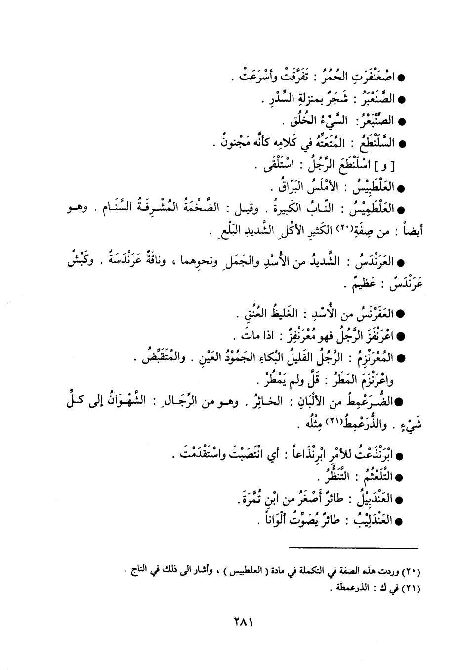 اصْعَنْفَرَتِ الحُمُرُ تَفَرَّقَتْ وأسْرَعَتْ . الصَّنَعْبَرُ شَجَرٌ بمنزلةِ السِّدْرِ . الصِّنْبَعْرُ السَّيِّءُ الخُلُق . السَّلَنْطَعُ المُتَعَتِّهُ في كَلامِه كأنَّه مَجْنونٌ . واسْلَنْطَعَ الرَّجُلُ اسْتَلْقَى . والعَلْطَبِيْسُ الأمْلَسُ البَرّاقُ . العَلْطَمِيْسُ النّابُ الكَبيرةُ . وقيل الضَّخْمَةُ المُشْرِفَةُ السَّنَام . وهو أيضاً من صِفَةِ الكَثيرِ الأكْلِ الشَّديدِ البَلْعِ . العَرَنْدَسُ الشَّديدُ من الأُسْدِ والجَمَلِ ونحوِهما ، وناقَةٌ عَرَنْدَسُةٌ . وكَبْشٌ عَرَنْدَسٌ عَظِيمٌ . العَفَرْنَسُ من الأُسْدِ الغَليظُ العُنُقِ . اعْرَنْفَزَ الرَّجُلُ فهو مُعْرَنْفِزٌ إذا ماتَ . المُعْرَنْزِمُ الرَّجُلُ القَليلُ البُكاءِ الجَمُوْدُ العَيْنِ . والمُتَقَبِّضُ . واعْرَنْزَمَ المَطَرُ قَلَّ ولم يَمْطُرْ . الضُّرَعْمِطُ من الألْبَانِ الخاثِرُ . وهو من الرِّجَالِ الشَّهْوَانُ إلى كلِّ شَيْءٍ . والذُّرَعْمِطُ مِثْلُه . ابْرَنْذَعْتُ للأمْرِ ابْرِنْذَاعاً أي انْتَصَبْتَ واسْتَقْدَمْتَ . التَّلَعْثُمُ التَّنَظُّرُ . العَنْدَبِيْلُ طائرٌ أَصْغَرُ من ابْنِ تُمَّرَةَ . العَنْدَلِيْبُ طائرٌ يُصَوِّتُ ألْوَاناً .