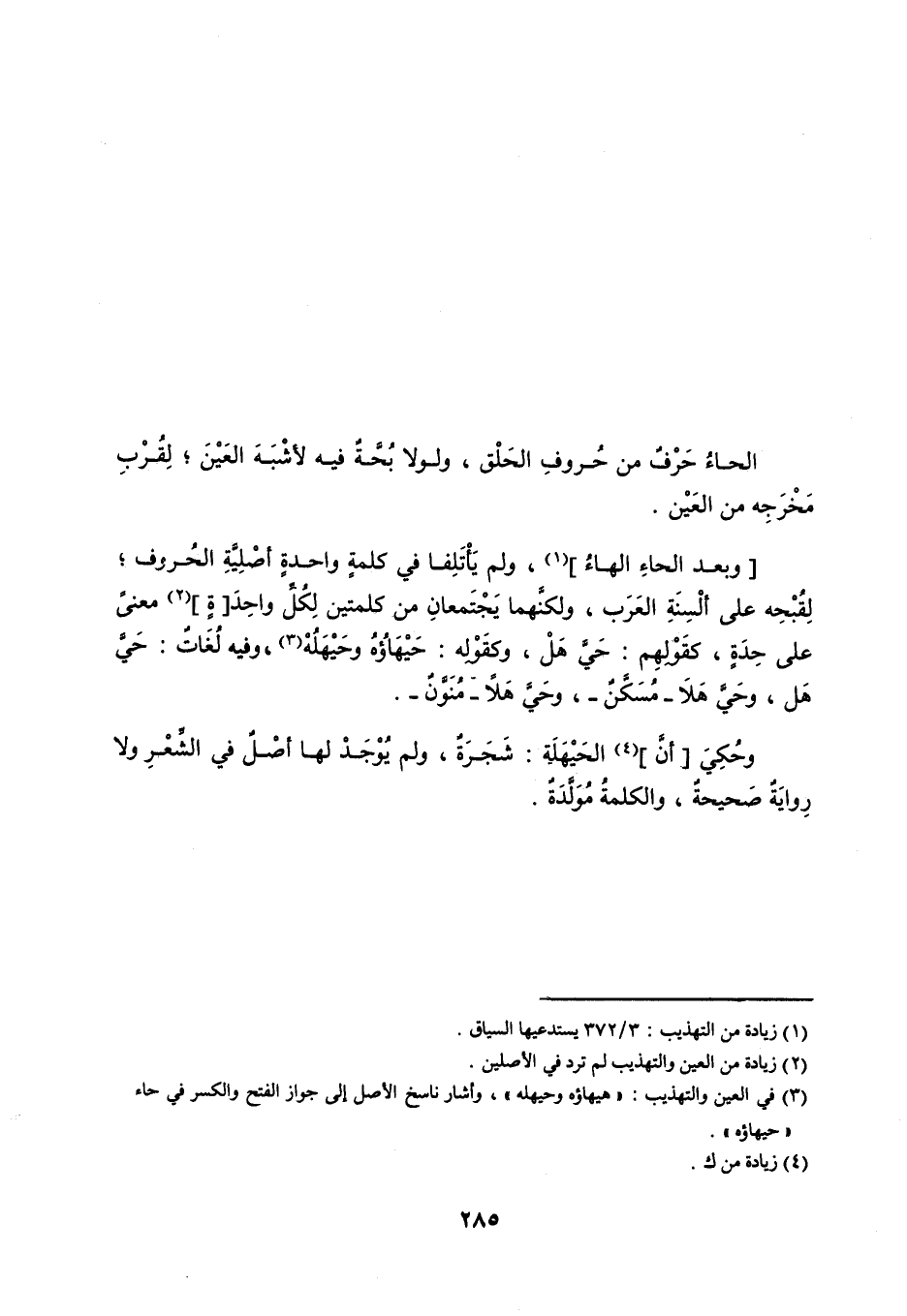 الحاءُ حَرْفٌ من حُروفِ الحَلْق ، ولولا بُحَّةٌ فيه لأشْبَهَ العَيْنَ ، لِقُربِ مَخْرَجِه من العَيْن . وبعد الحاءِ الهاءُ ، ولم يَأْتَلِفا في كلمةٍ واحدةٍ أصْلِيَّةِ الحُروف ؛ لِقُبْحِه على ألْسِنَةِ العَرَبِ ، ولكنَّهما يَجْتَمعانِ من كلمتين لِكُلِّ واحِدَةٍ معنىً على حِدَةٍ ، كقَوْلِهِم : حَيَّ هلْ ، وكقَوْلِه : حَيْهَاؤُهُ وحَيْهَلُهْ ، فيه لُغَاتٌ : حَيَّ هَل ، وحَيَّ هَلاَ - مُسَكَّنٌ - وحَيَّ هَلاً - مُنَوَّنٌ - . وحُكِيَ أنَّ الحَيْهَلَة : شَجَرَةٌ ، ولم يُوْجَدْ لها أَصْلٌ في الشِّعْرِ ولا رِوايَةٌ صَحيحةٌ ، والكلمةُ مُوَلَّدَةٌ .