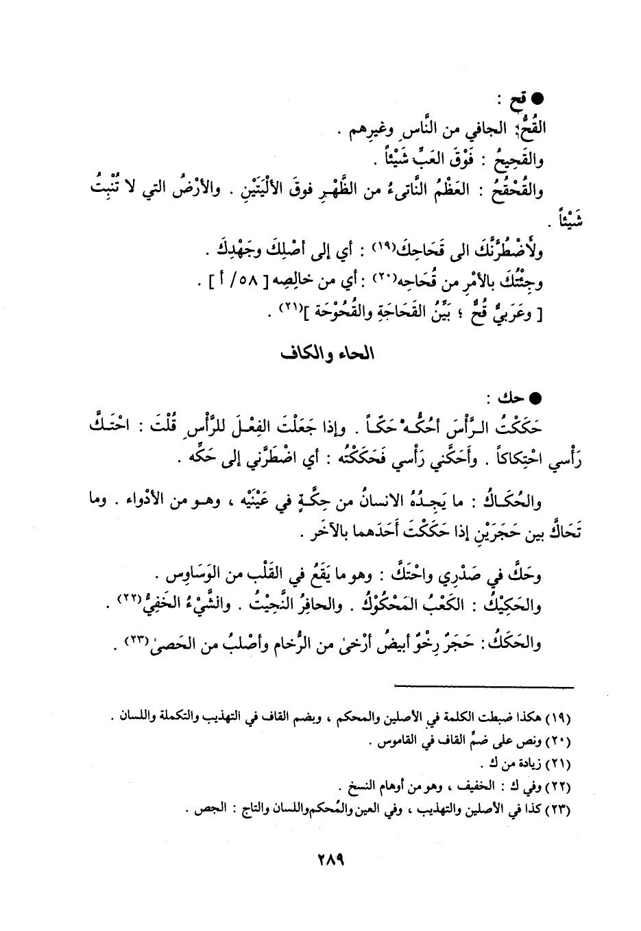 حك حَكَكْتُ الرَّأسَ أحُكُّهْ حَكّاً . وإذا جَعَلْتَ الفِعْلَ للرَّأسِ قُلْتَ : احْتَكَّ رَأْسي احْتِكاكاً . وأَحَكَّني رَأْسي فَحَكَكْتُه : أي اضْطَرَّني إلى حَكَّه . والحُكّاكُ : ما يَجِدُهُ الإنسانُ من حِكَّةٍ في عَيْنَيْه ، وهو من الأدْواء . وما تَحَاكَّ بين حَجَرَيْنِ إذا حَكَكْتَ أَحَدَهما بالآخَر . وحَكَّ في صَدْرِي واحْتَكَّ : وهو ما يَقَعُ في القَلْب من الوَسَاوِس . والحَكِيْكُ : الكَعْبُ المَحْكُوْكُ . والحافِرُ النَّحِيْتُ . والشَّيءُ الخَفِيُّ . والحَكَكُ : حَجَرٌ رِخْوٌ أبيضُ أرْخى من الرُّخام وأصْلبُ من الحَصى